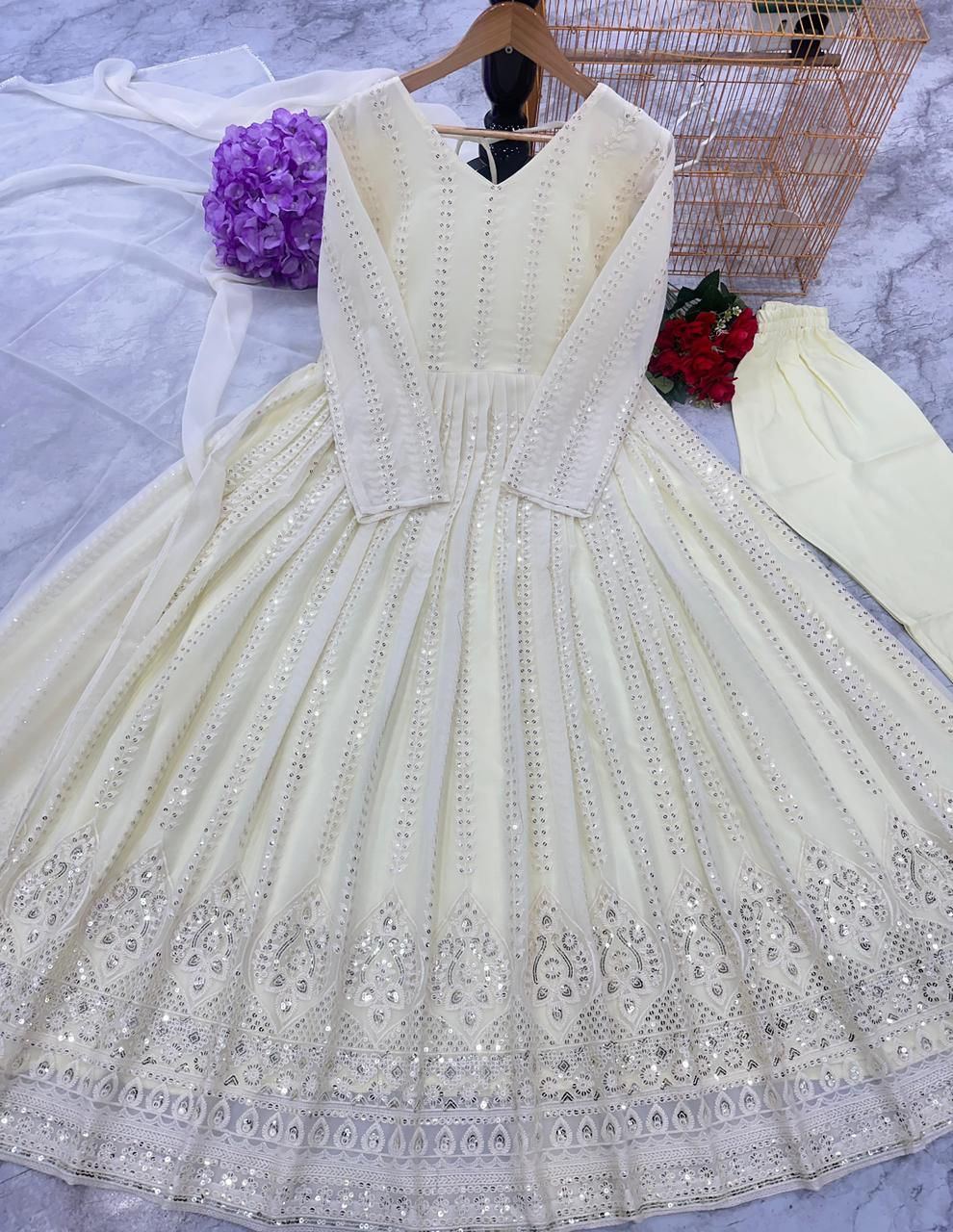 Crafted from luxurious Micro Cotton, this elegant piece is designed to offer both comfort and style. With a generous length of 52 inches and a voluminous flair extending to 3.00 meters, this ensemble promises a grand and flowing silhouette that captures the essence of grace and femininity. The bottom is tailored from heavy Micro Cotton, ensuring durability and comfort, complemented by an elastic waistband for a snug and adjustable fit.