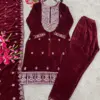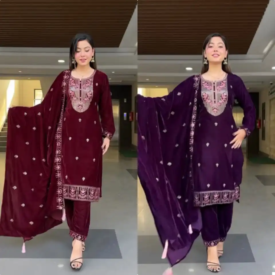 Bottom: Complementing the top, the bottom piece is also crafted from heavy viscose velvet and adorned with intricate embroidery and sequin work. This harmonious design continuity ensures a cohesive and stunning appearance from head to toe.
