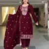 Dupatta: Complete your look with the matching dupatta, a masterpiece in itself. It mirrors the top and bottom’s grandeur with its heavy viscose velvet fabric and delicate embroidery sequin work, adding an extra layer of elegance.