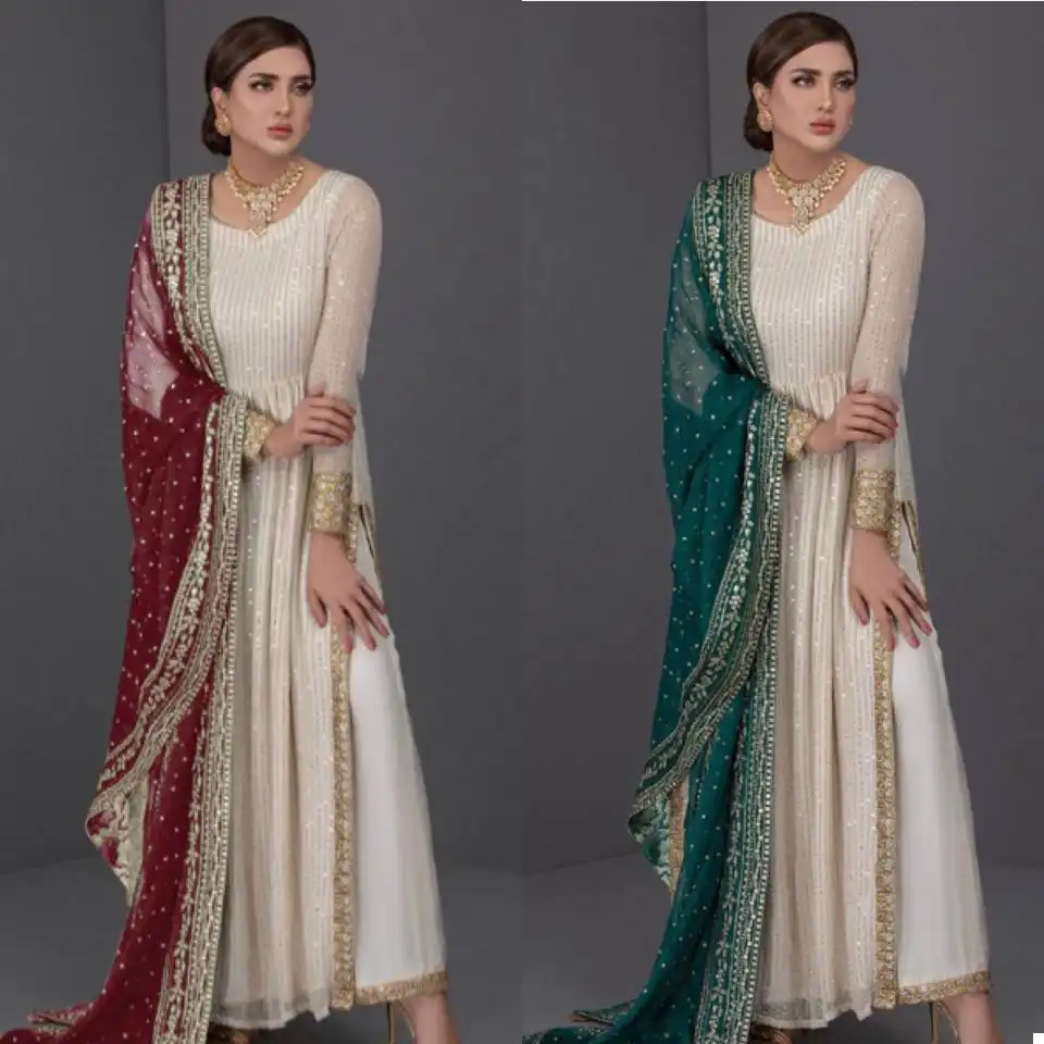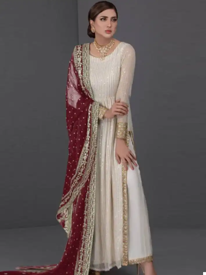 - Ornate Dupatta: A dupatta of the same exquisite Faux Georgette drapes beautifully, adorned with heavy embroidery and sequins work, framing the outfit with finesse.