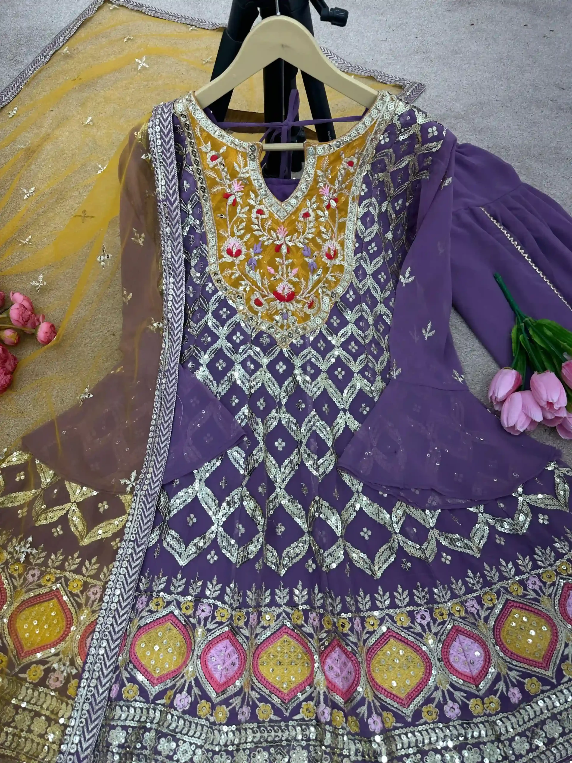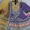 Glamorous Heavy Net Dupatta: Completing the look is the heavy net dupatta, embellished with matching embroidery and 5mm sequins work. It’s the perfect accessory to drape elegantly, adding a layer of grace to your outfit.