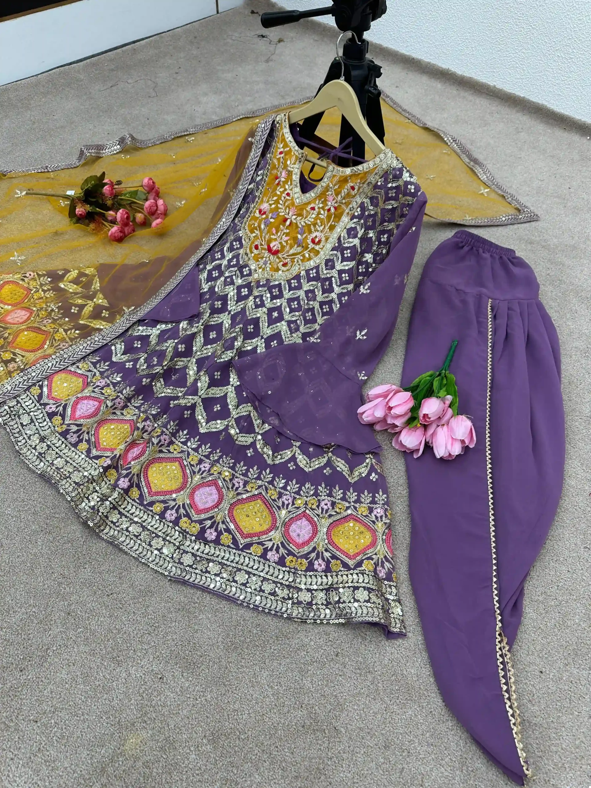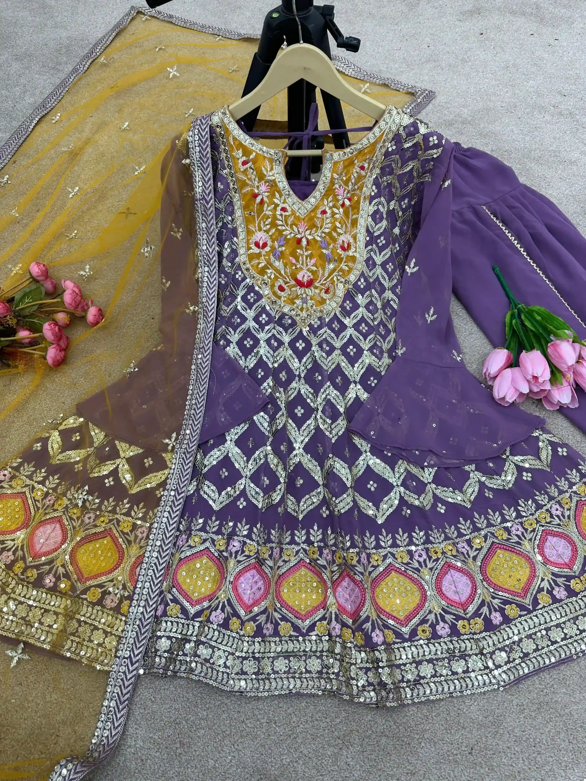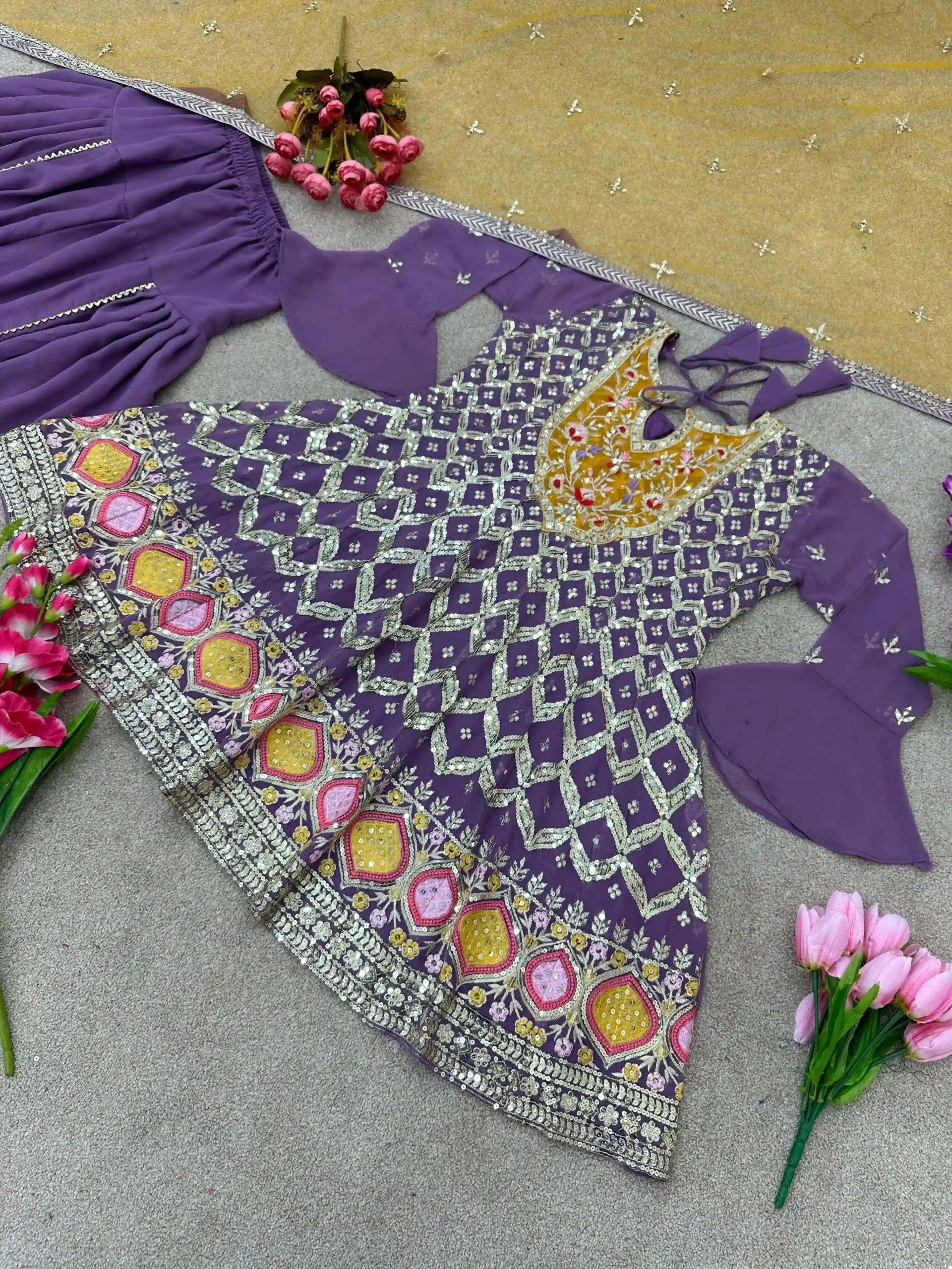 Exquisite Faux Georgette Top with Sequins: The highlight of this ensemble is the top, crafted from premium Faux Georgette. It features heavy embroidery and a dazzling display of 5mm sequins work, adding a radiant sparkle to your presence. The fancy sleeves complement the top’s design, adding an element of chic style to the overall look.