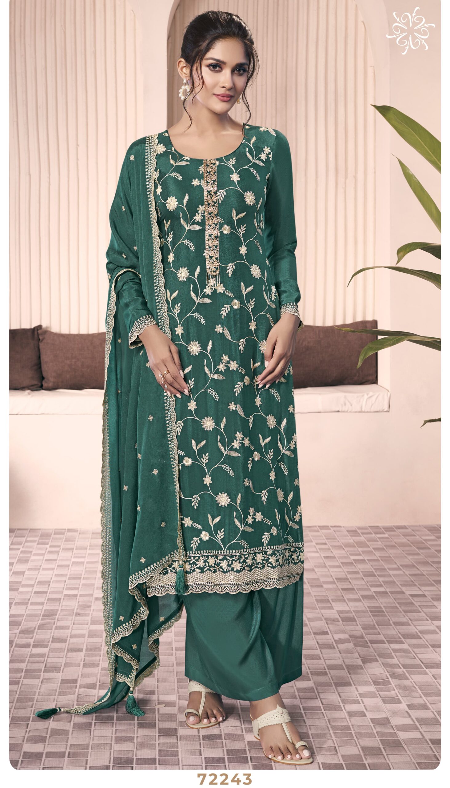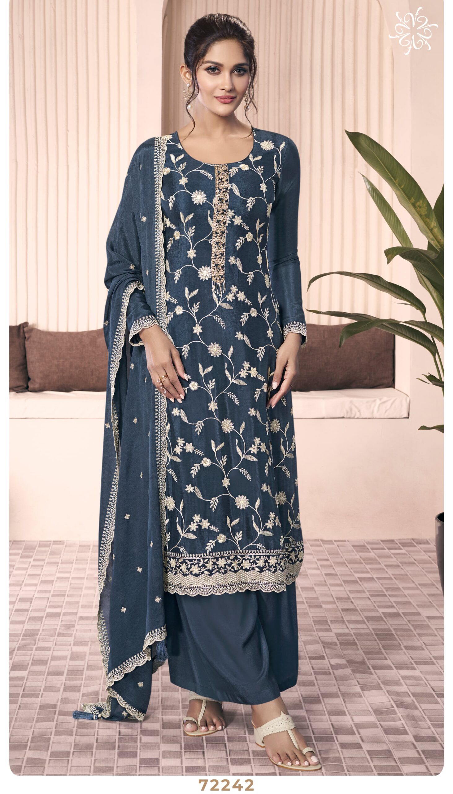 Discover the elegance of Vinay Kuleesh Shazia, a premium collection of designer dress materials crafted for the modern woman. Featuring fancy thread embroidery on chinon fabric, this range is the epitome of sophistication. Paired with santoon bottoms and a thread-embroidered chinon dupatta, it offers a perfect blend of comfort and luxury. Ideal for festive occasions, weddings, or formal gatherings, this collection brings out your best style effortlessly.
