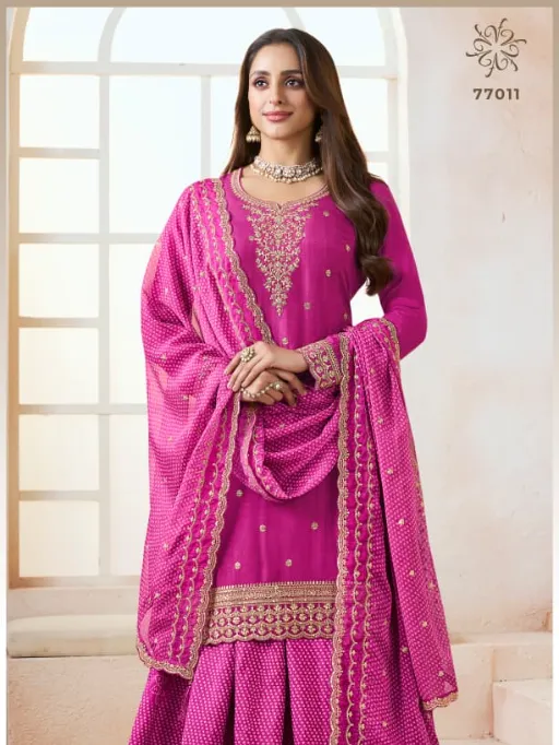 Vinay Kuleesh Bhavya Wholesale Moga Silk Embroidered Sharara Suit.