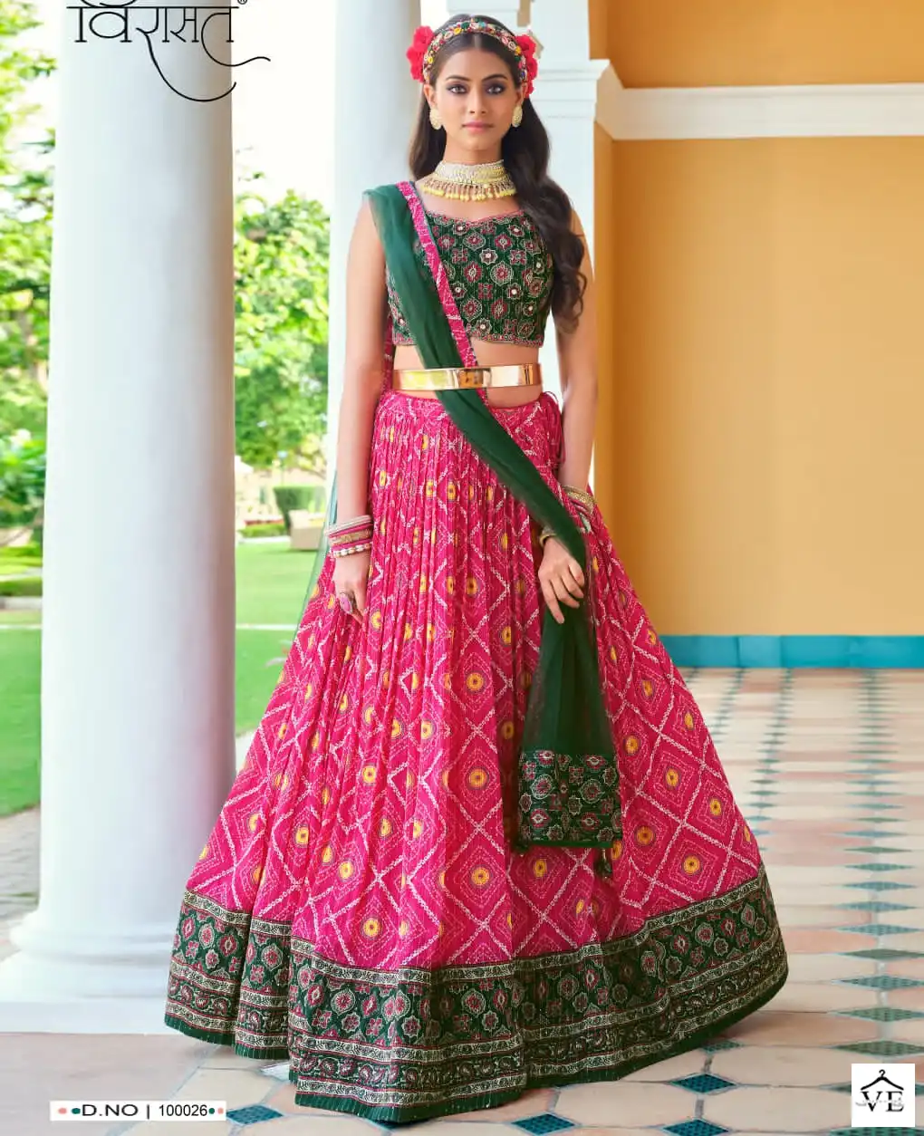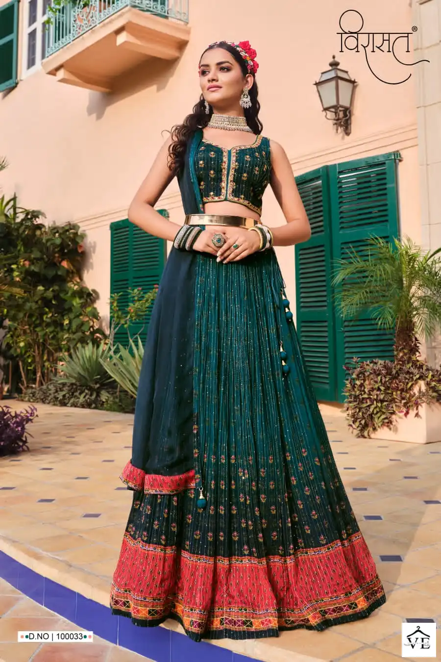 Virasat Saanvi Heavy Pure Chinon Wholesale Lehenga Choli Catalog of 5 Pcs. We deal in Kurtis, Sarees, Dresses Materials, Leggings, and Designer Salwar Kameez.