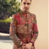 Buy Vishnu Laxmi RS30 maroon-pink PV silk wedding couple set with foil art sherwani & lehenga jacket. Sizes M–XL. Combo price ₹19750 + 12% GST.