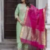 Details Top Fabric: Cotton Blend | Bottom Fabric: Cotton Blend | Dupatta Fabric: Chanderi Silk Dupatta | Cut: 2.10 Mtr Approx | Sleeve Length: Three-quarter Sleeves | Top Length: 44 to 45 Inch Approx | Size Set: (s to 2xl)