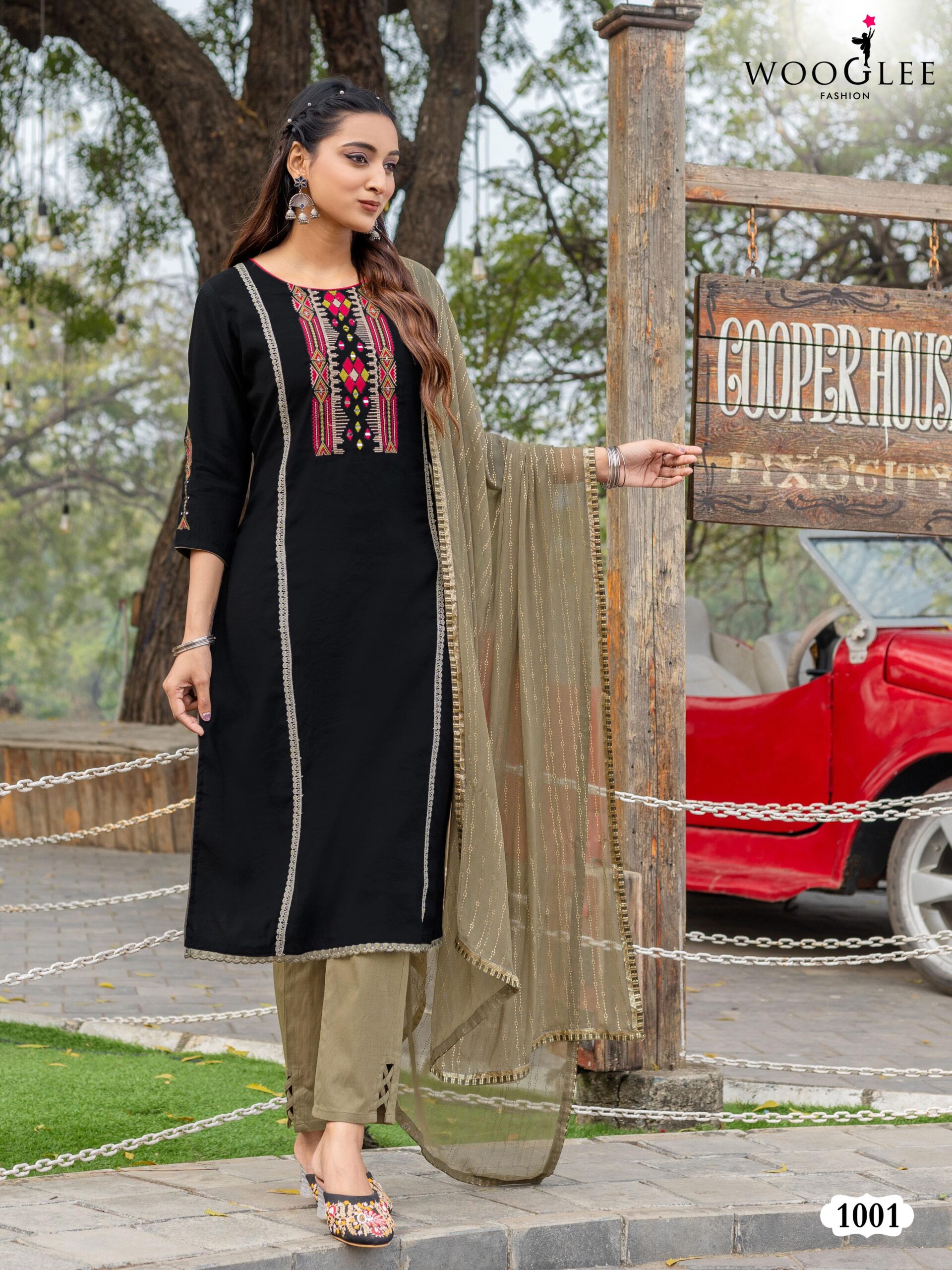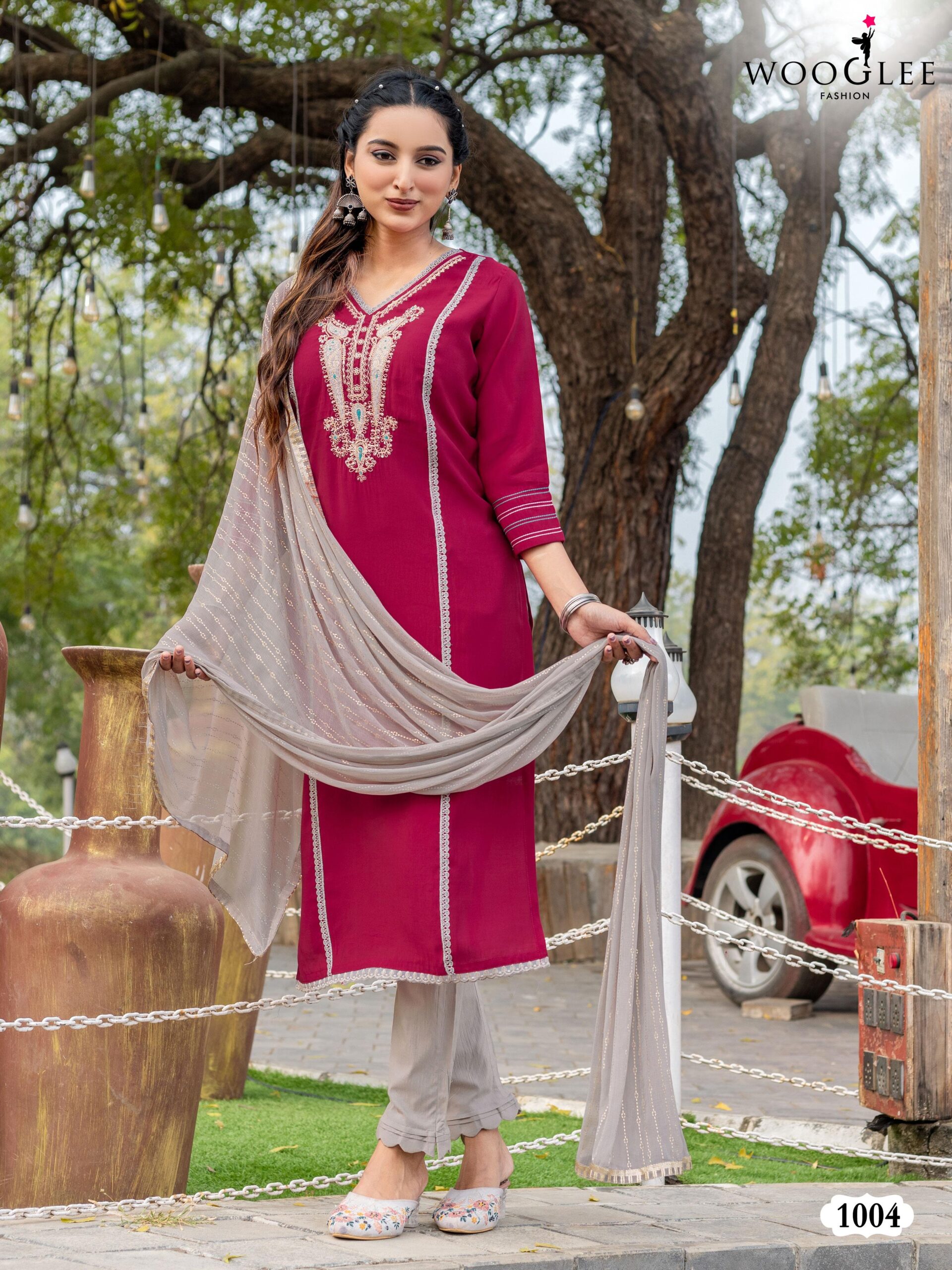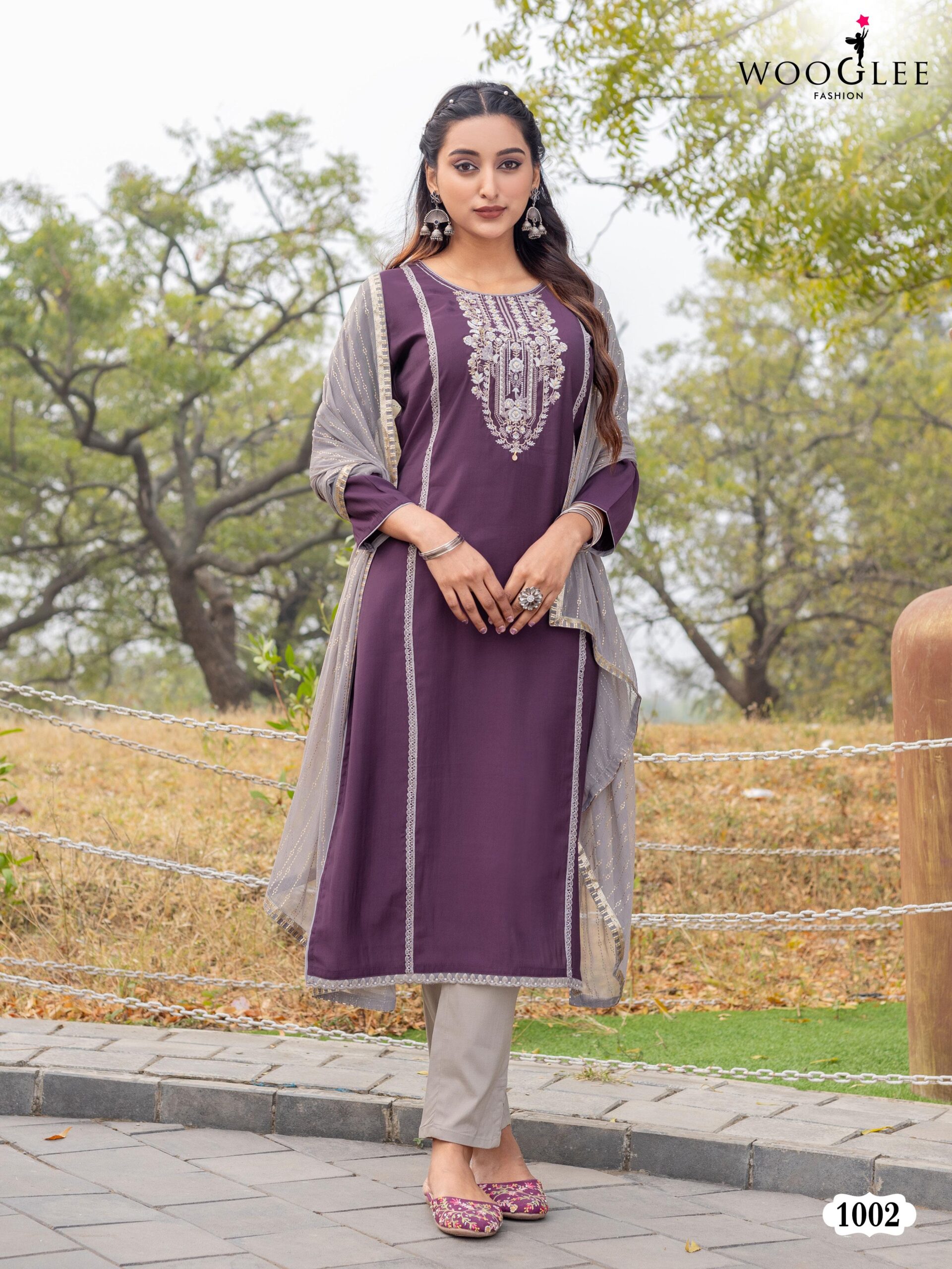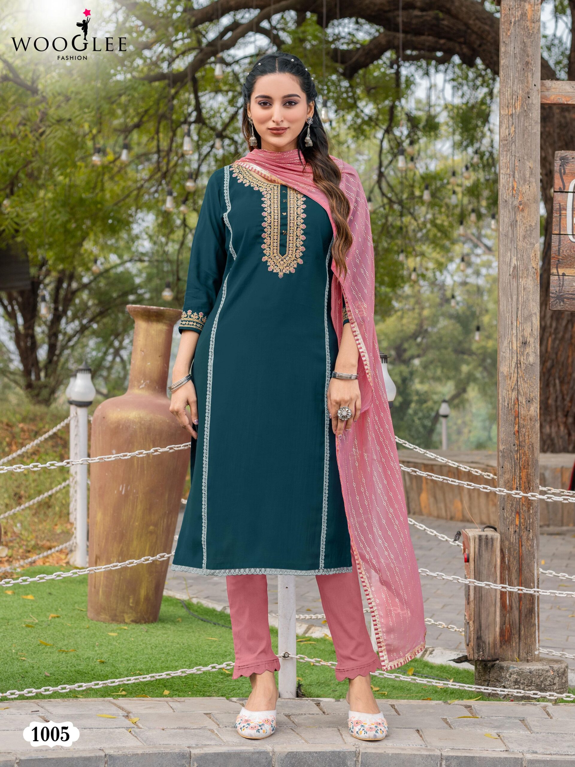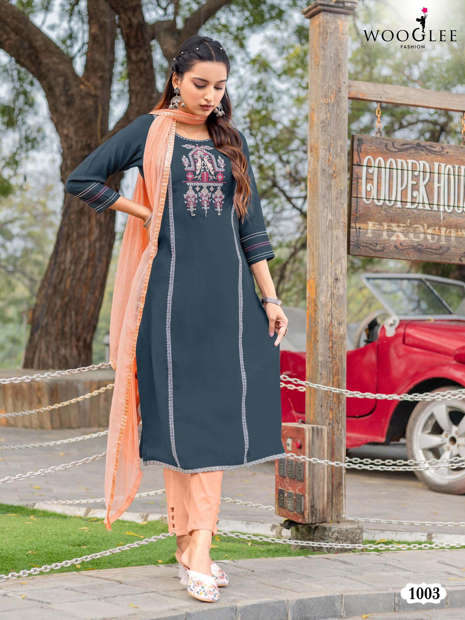 Wooglee Moksha Viscose Silk Handwork Kurti With Bottom Dupatta Wholesale Catalog.