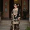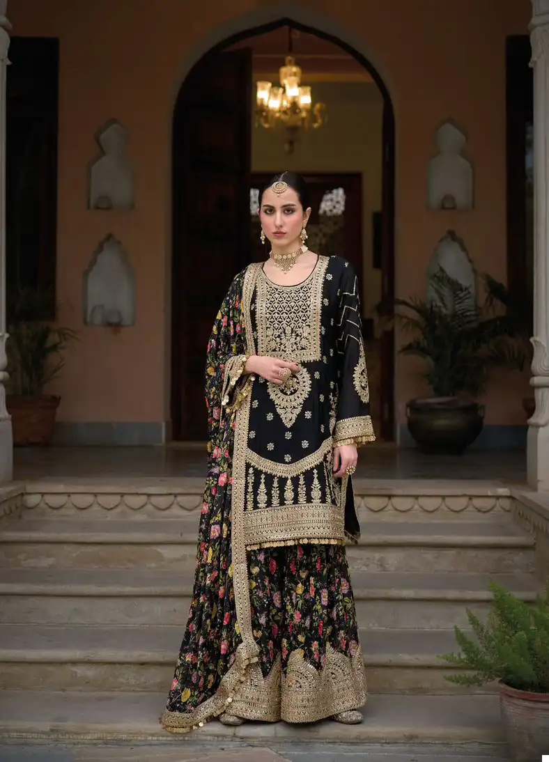 - Dupatta: Pure Chinon – The scarf or dupatta accompanying the outfit is made of pure Chinon fabric.