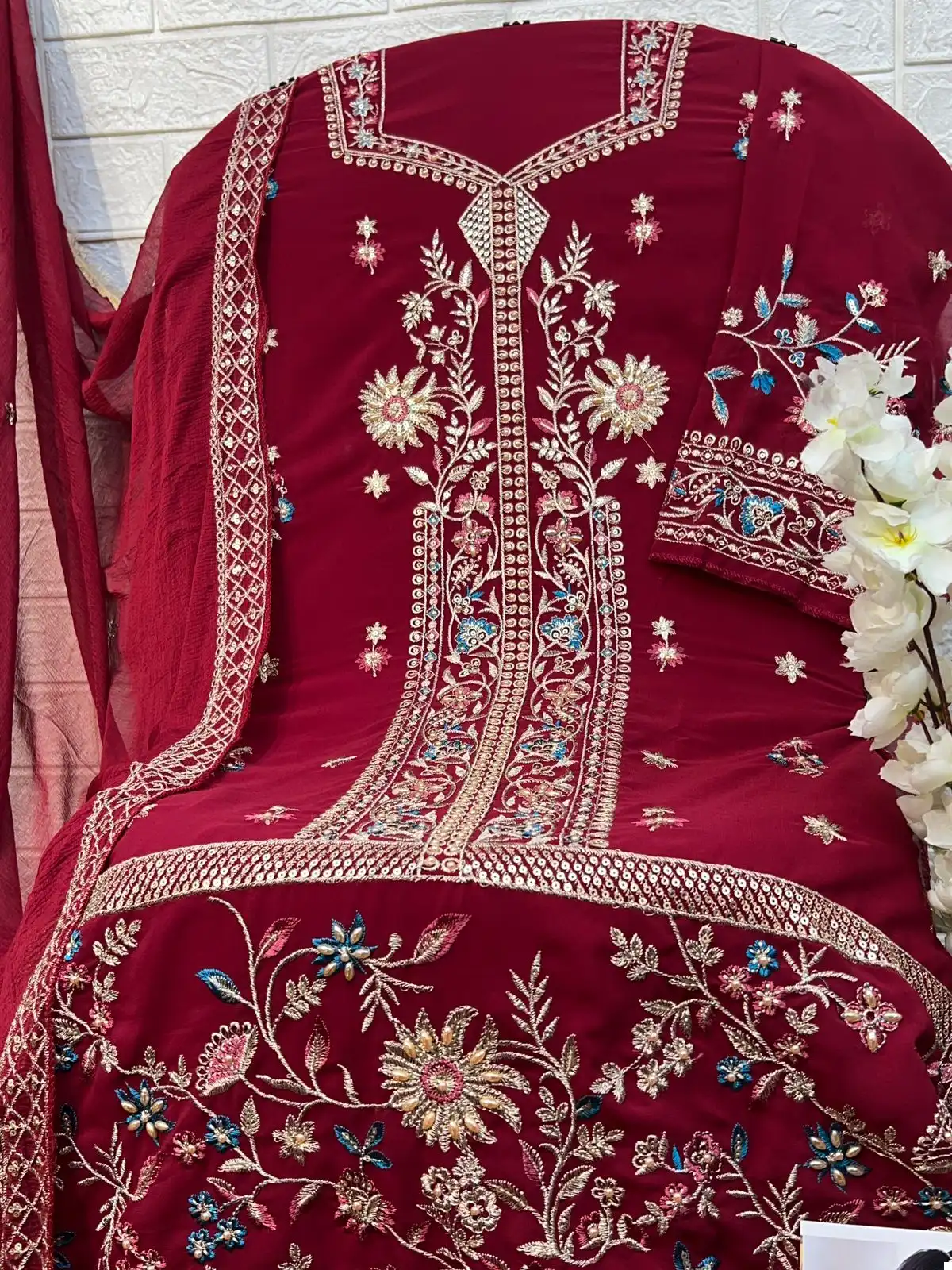 - Fabric: Faux Georgette with heavy embroidery. The dupatta is made of faux Georgette fabric and features heavy embroidery, enhancing its visual appeal and adding to the overall richness of the ensemble.