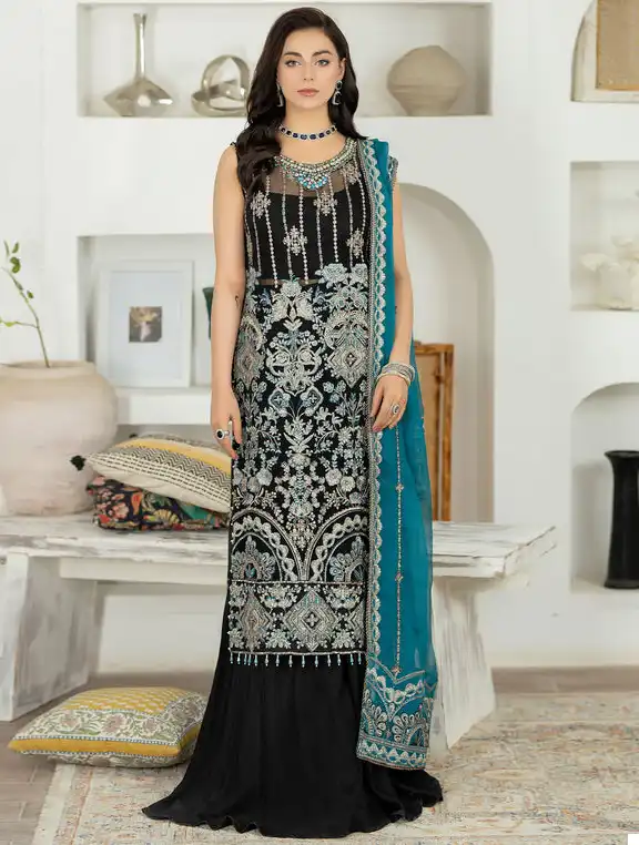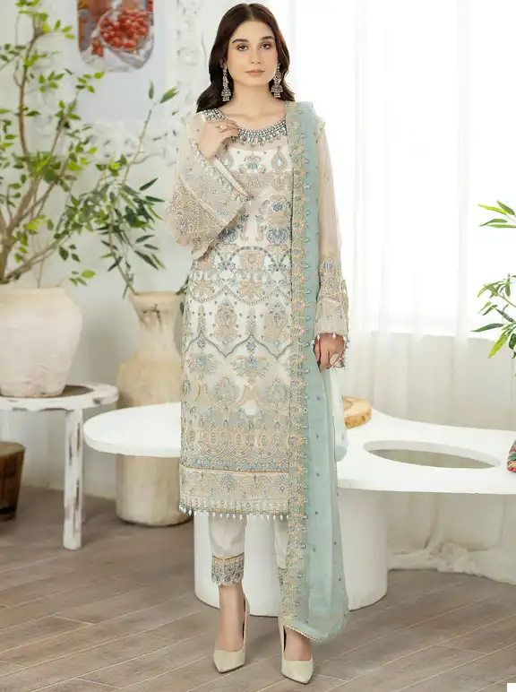 - Fabric: The top is crafted from high-quality georgette fabric, known for its lightweight and flowy texture, while the bottom features santoon fabric with santoon inner for comfort and durability. The dupatta is made from nazmin with heavy embroidery, adding a touch of elegance to the ensemble.