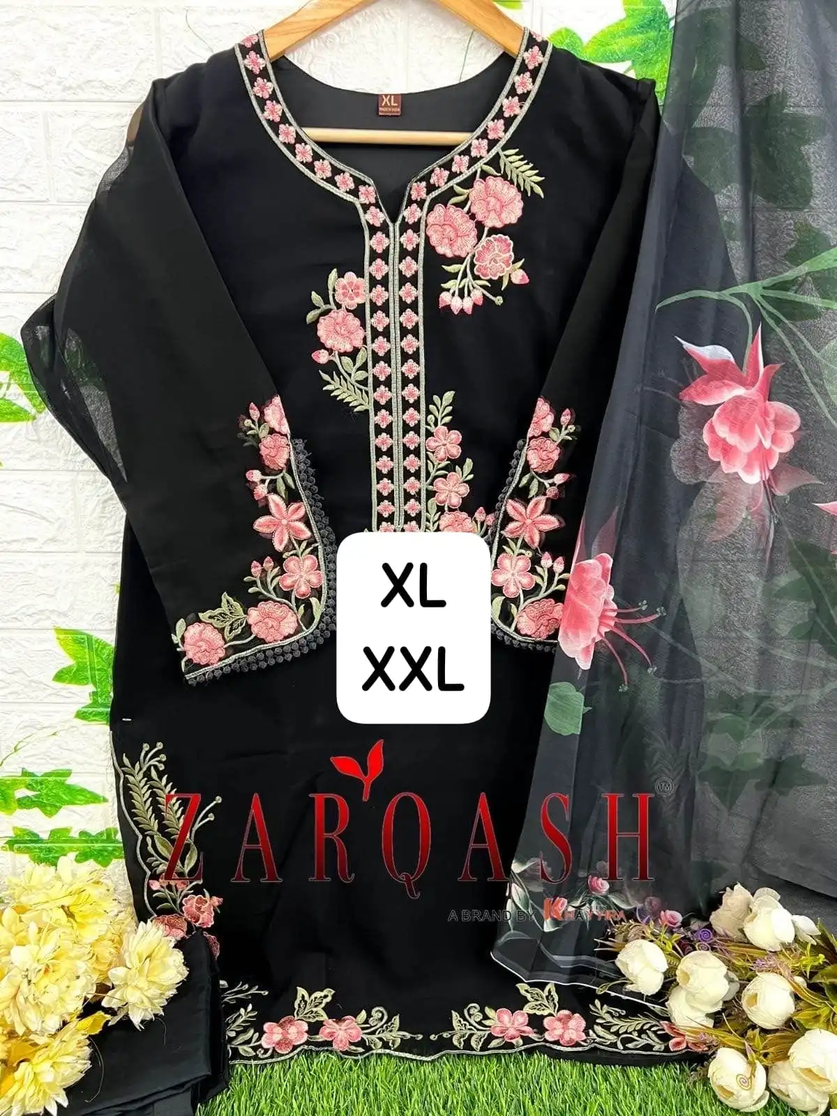 - Top: The top is a piece of faux georgette, lavishly adorned with embroidery, paired with a comfortable Santoon inner. This blend offers both the beauty of the embroidery and the comfort of the fabric.