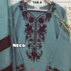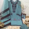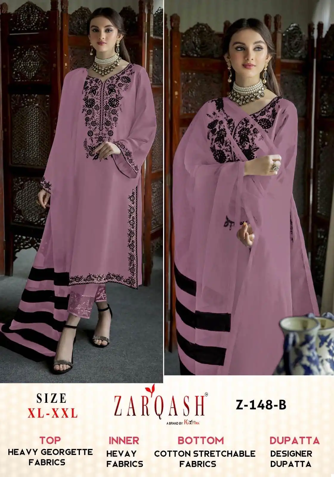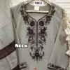 - Top: Made from heavy georgette fabric, which is embroidered. Georgette is a lightweight, crinkly fabric that usually has a bouncy, flowing look. The “heavy” descriptor often implies that the fabric is less sheer than traditional georgette, with denser embroidery adding weight and texture.