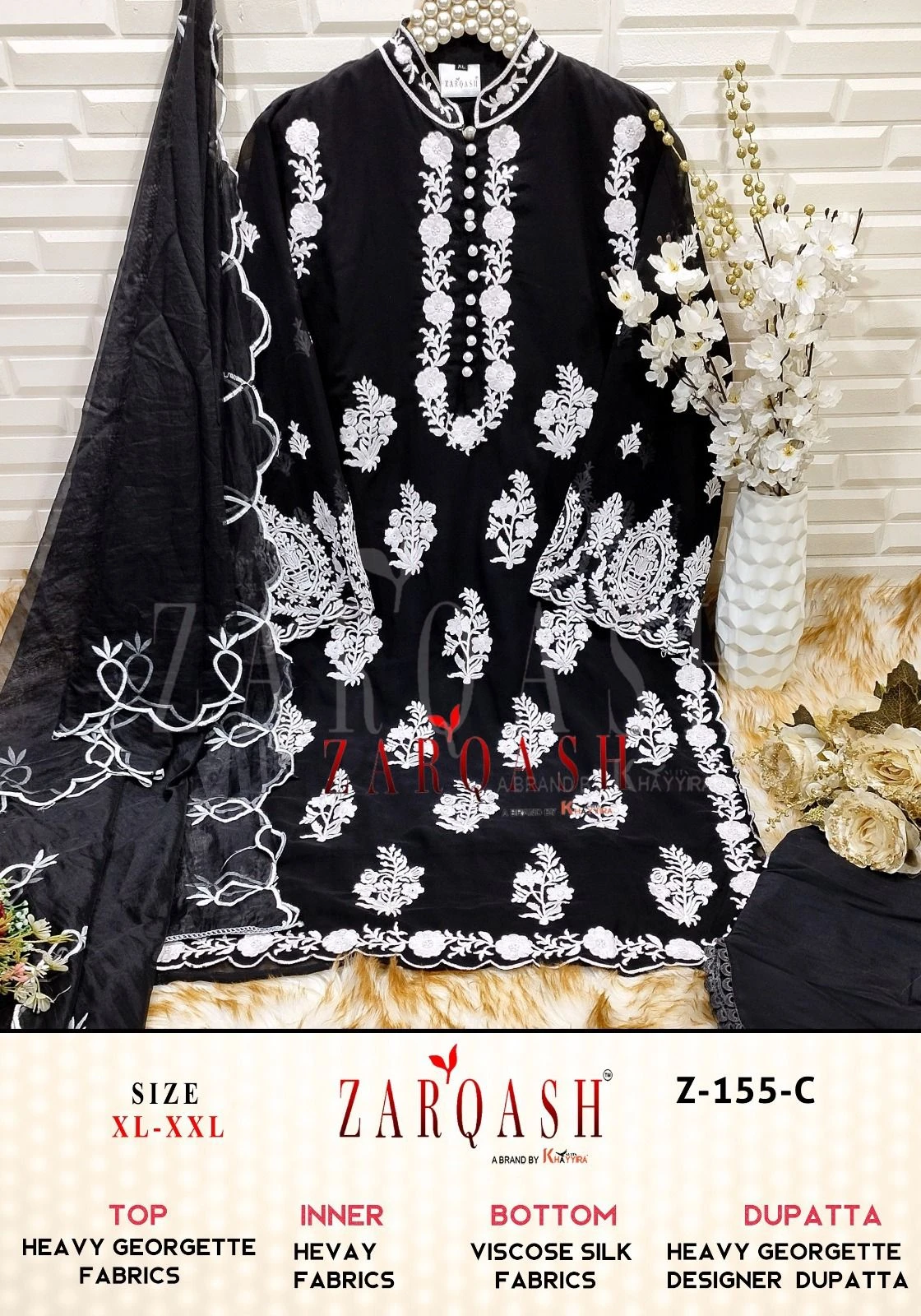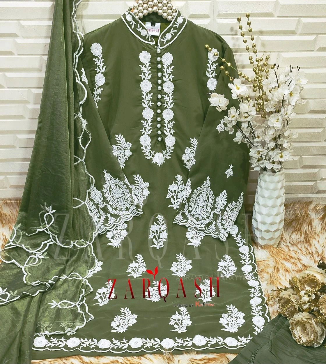 🧣 Dupatta: Complete your look with an Organza dupatta, beautifully embroidered with cut work, adding an extra layer of grace and refinement to your outfit.