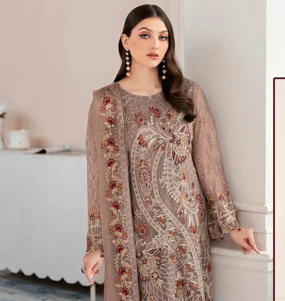 This product offers a stylish and elegant outfit, perfect for formal events and special occasions. The ensemble combines the lightweight allure of Georgette with the comfort of Santoon and the delicate elegance of Nazneen fabric.