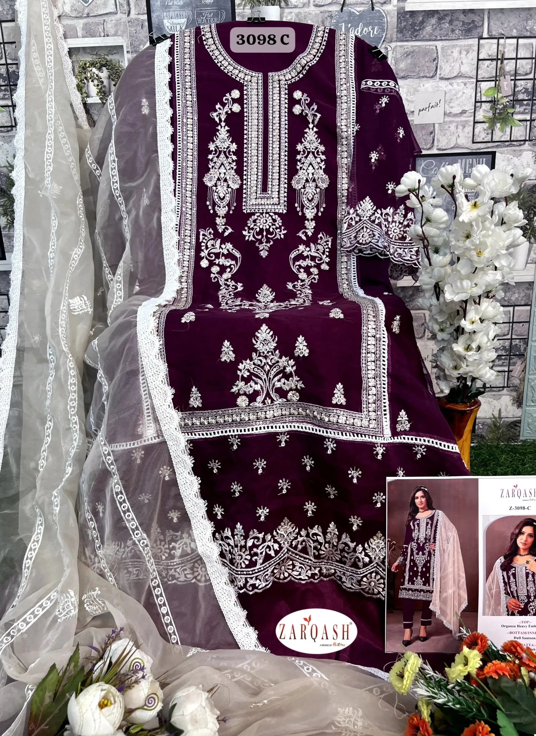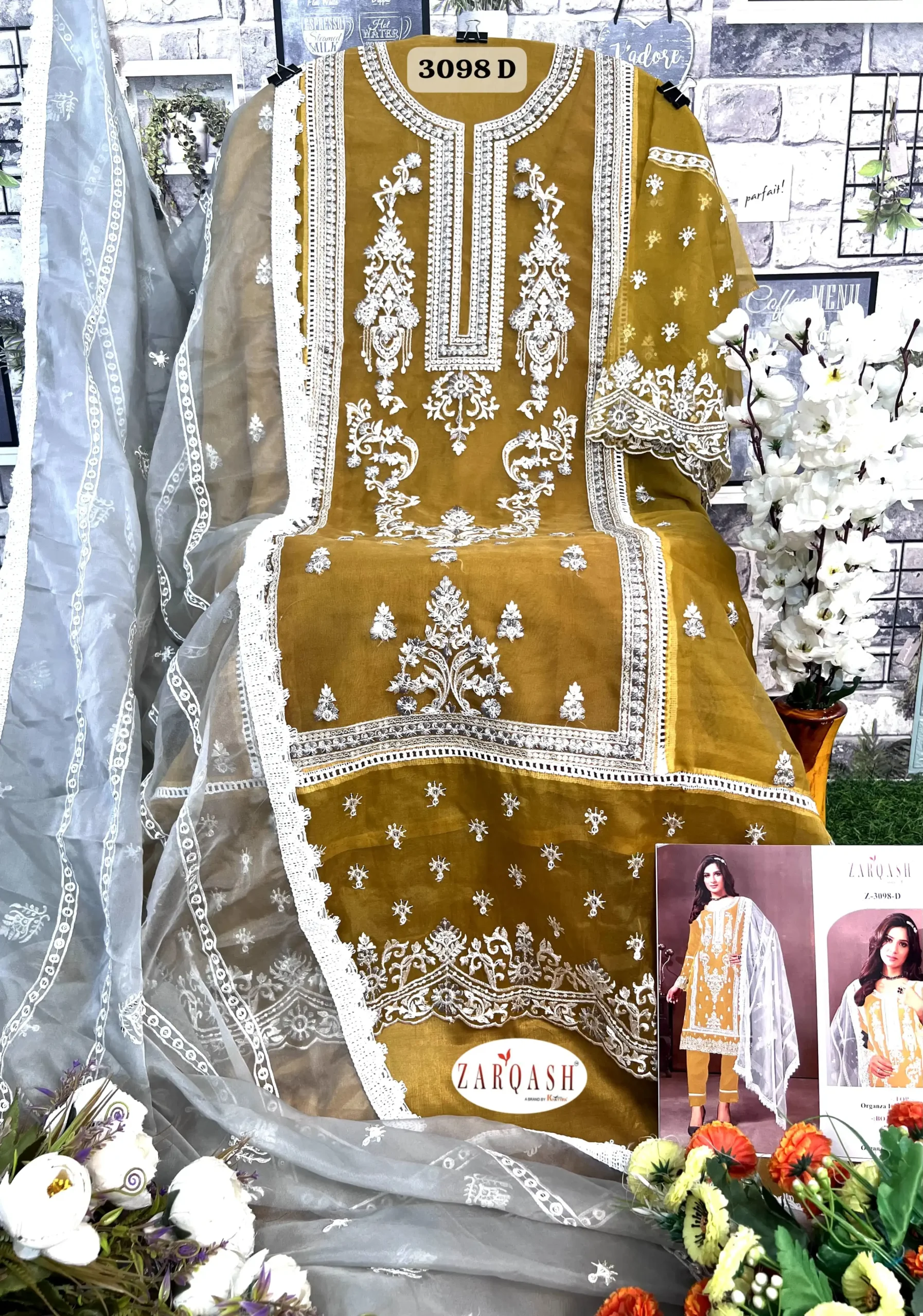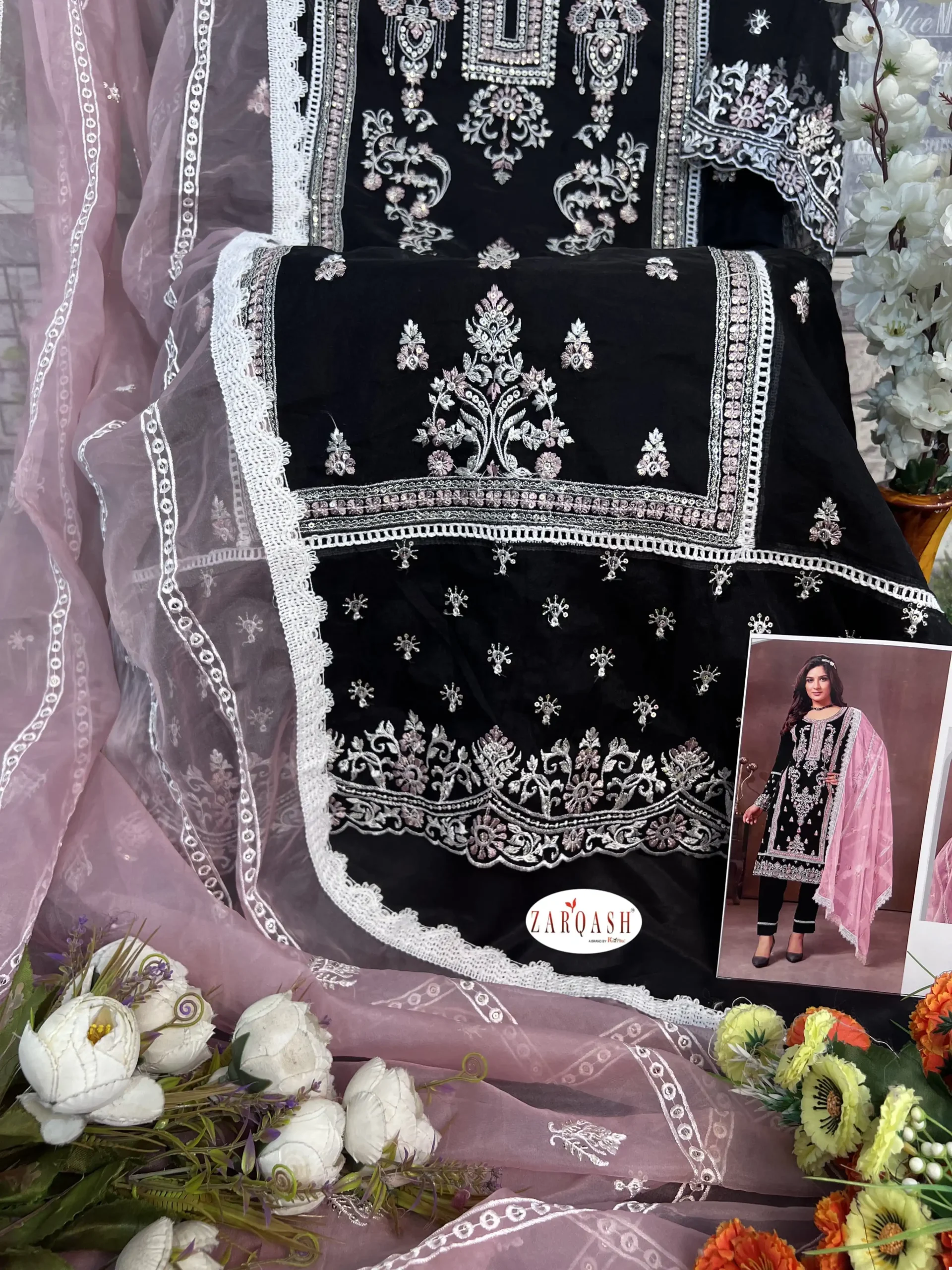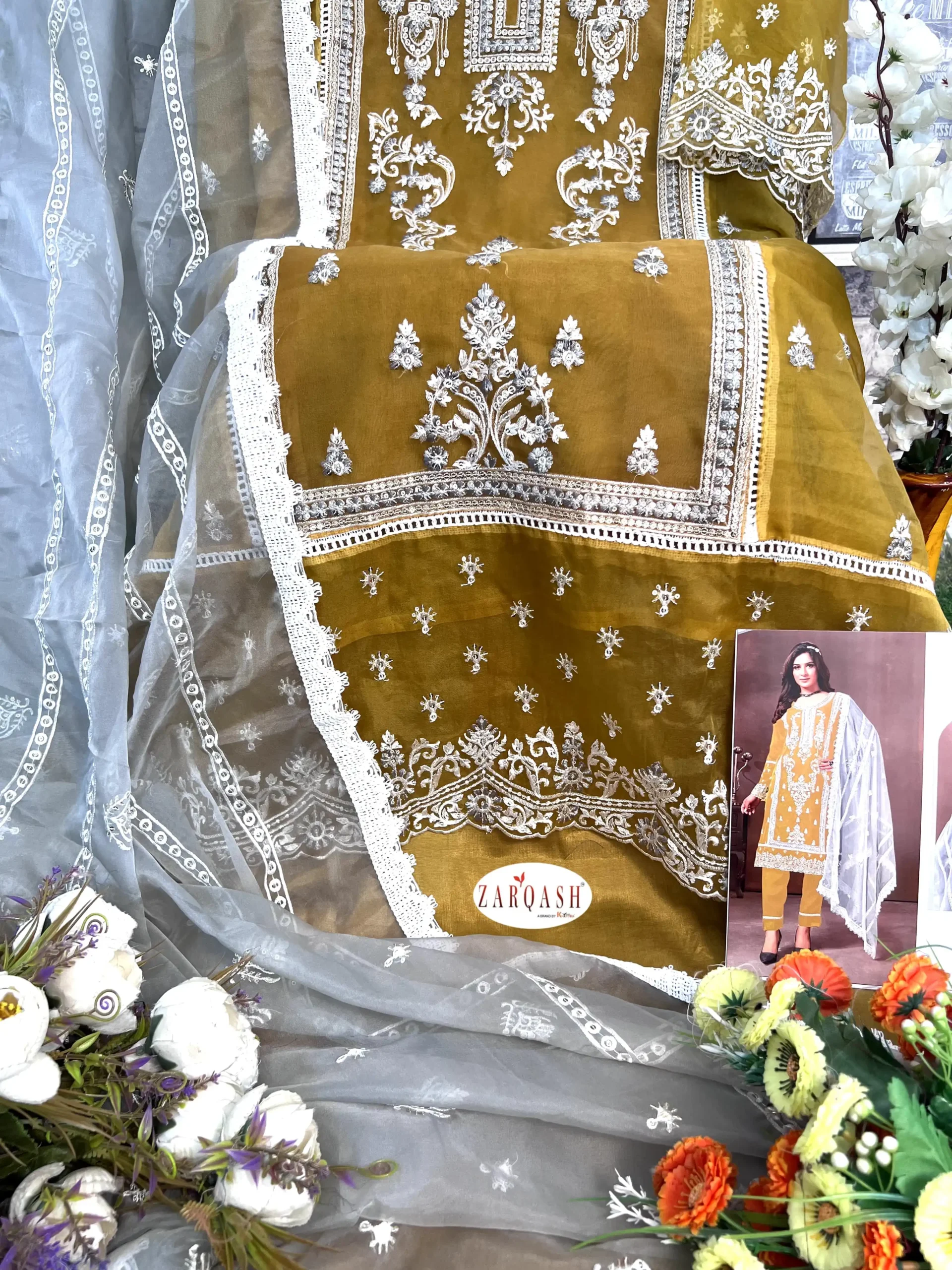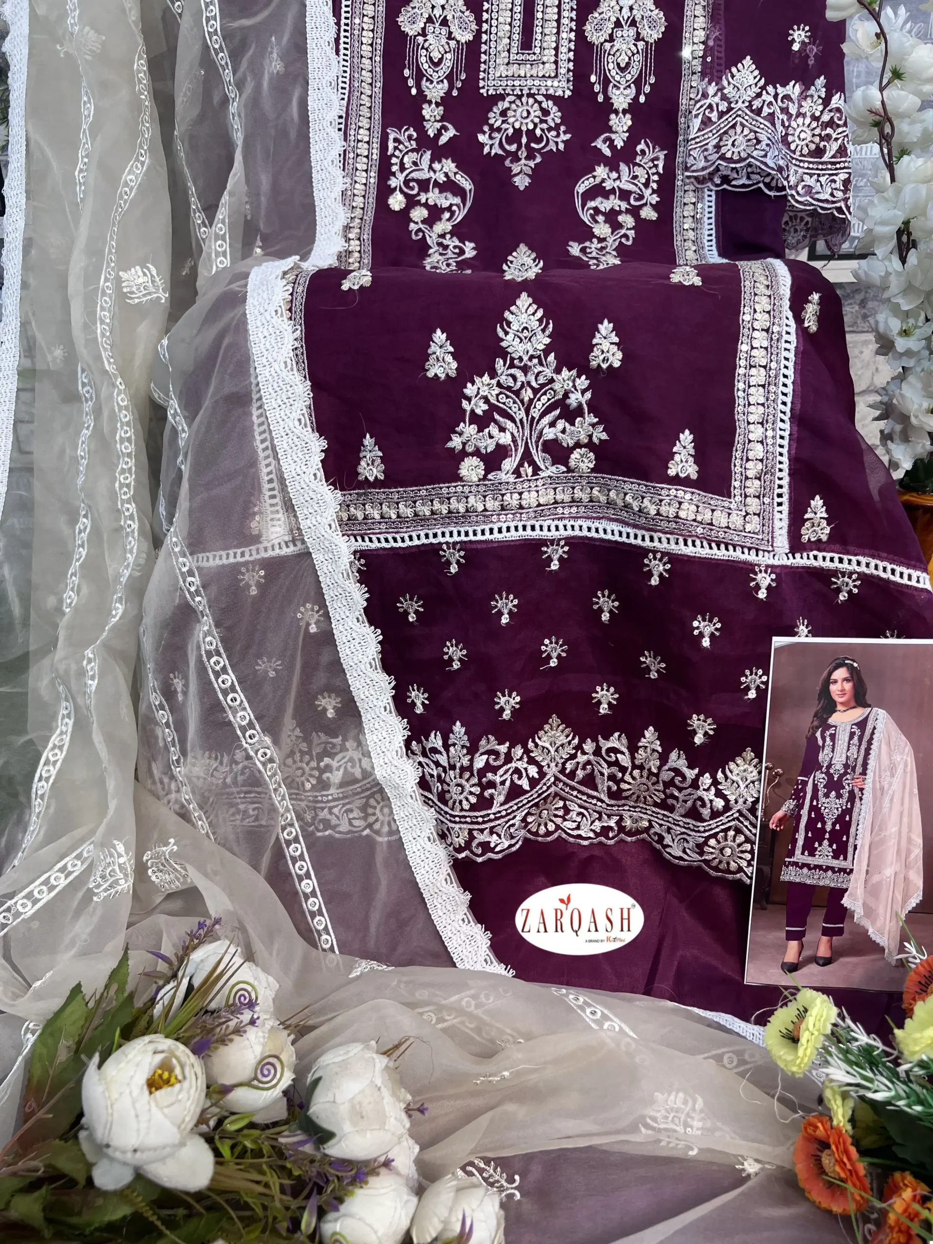 This description is typical of a South Asian outfit, possibly a salwar suit or an Anarkali suit, which would be suitable for formal events, celebrations, or possibly weddings. The embroidered organza adds a level of sophistication to the outfit, and the availability of different colors allows for personal preference in styling.