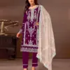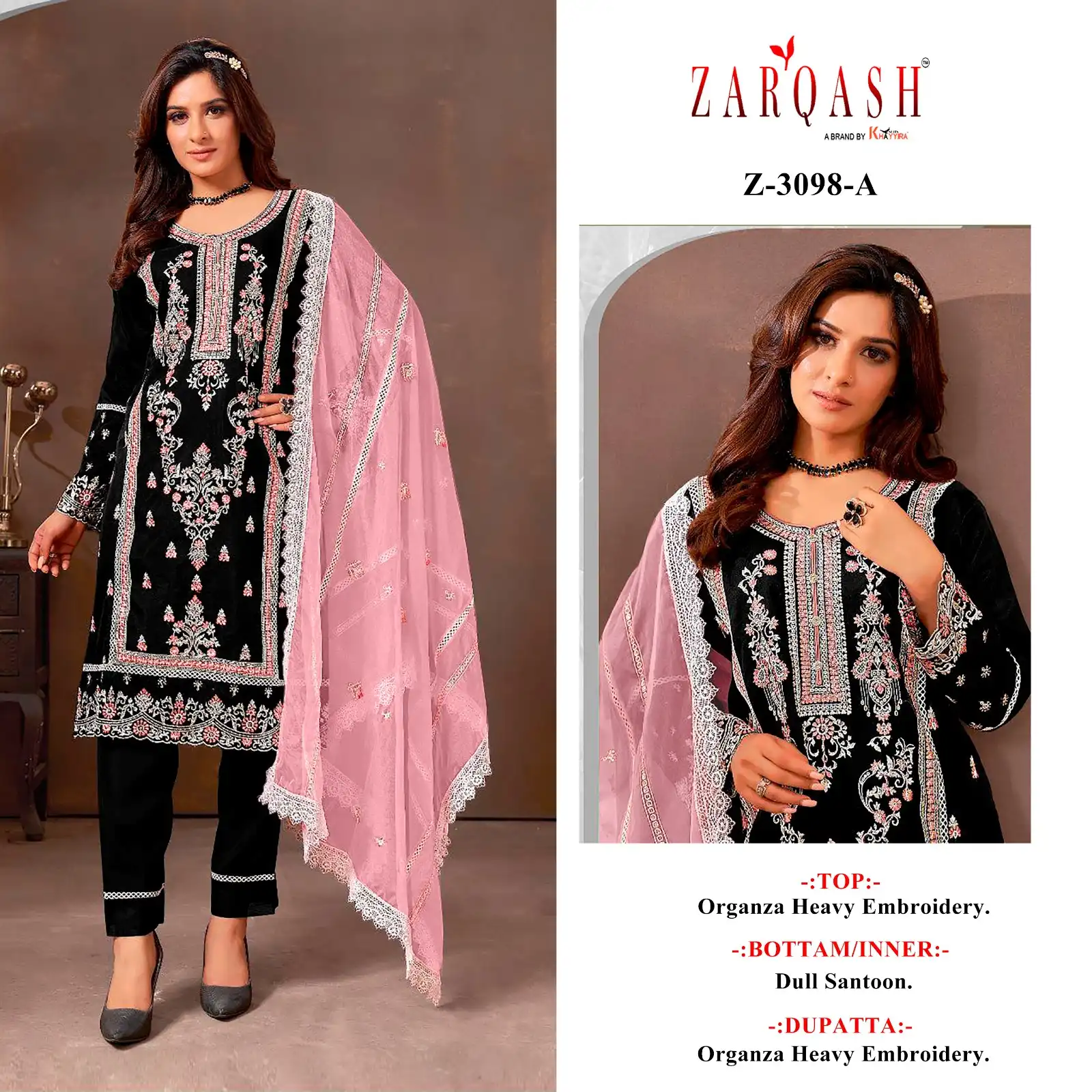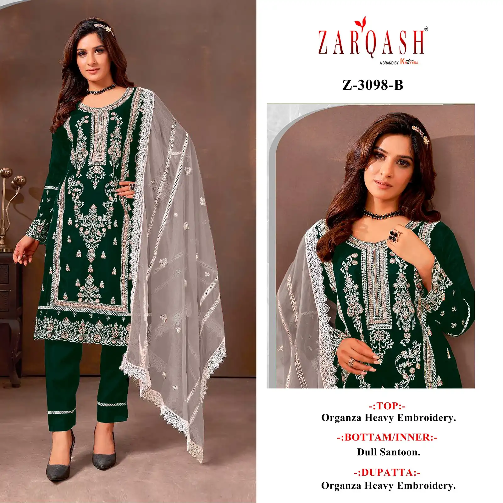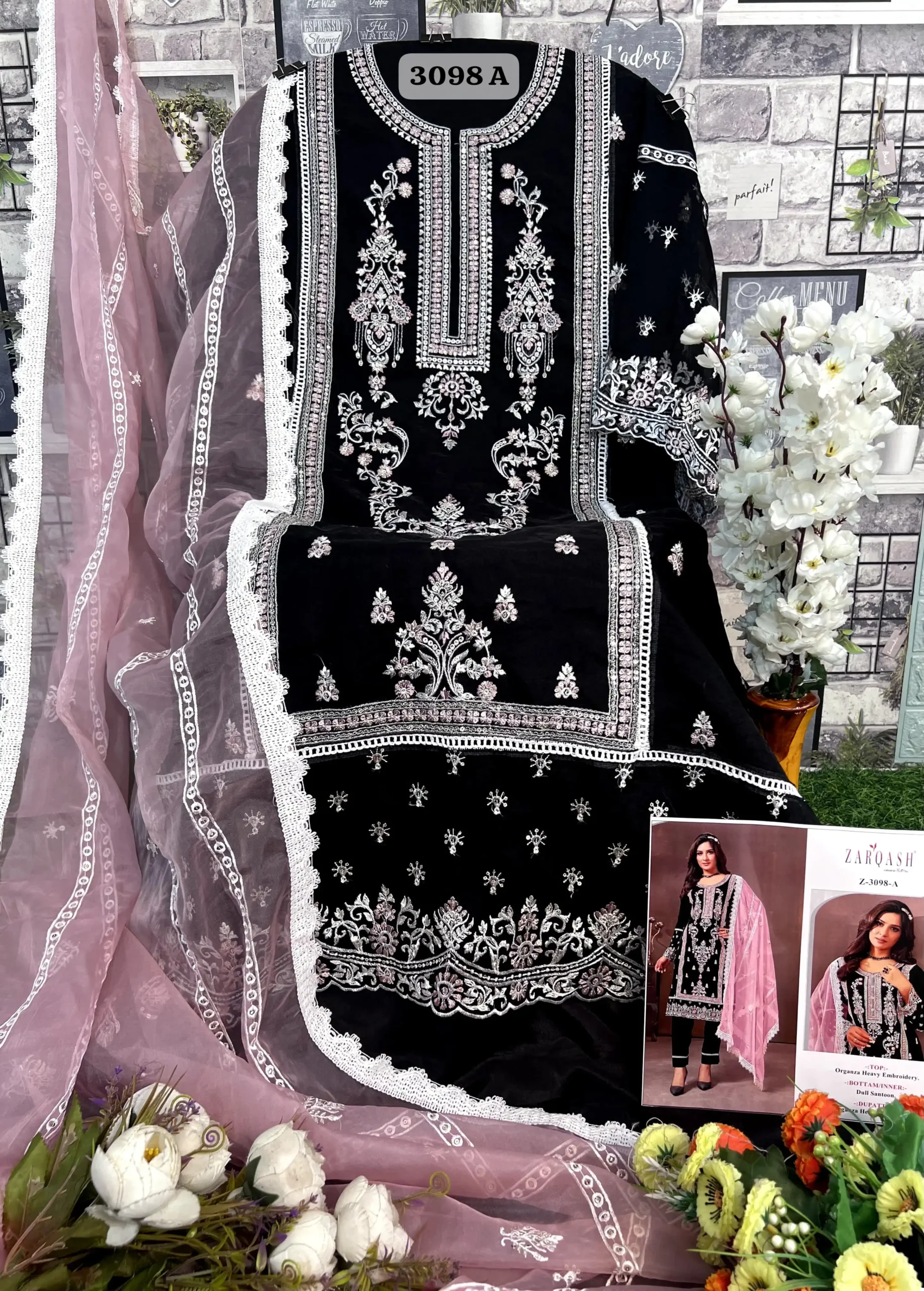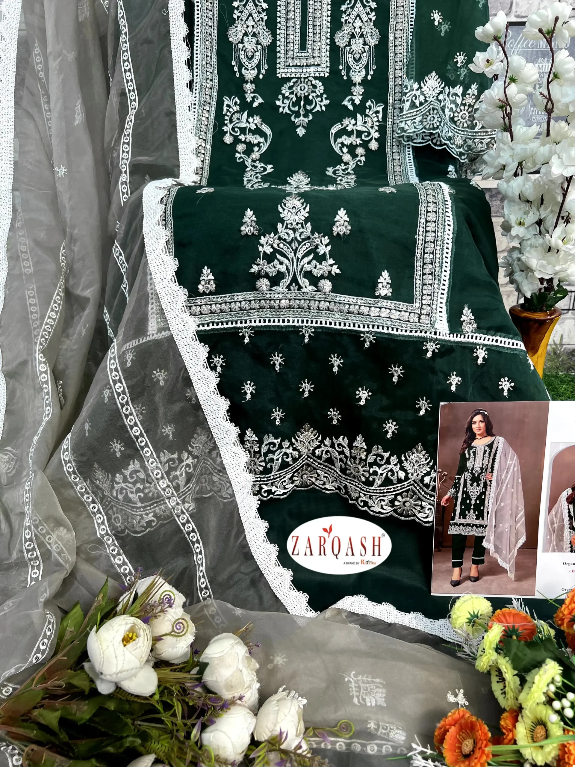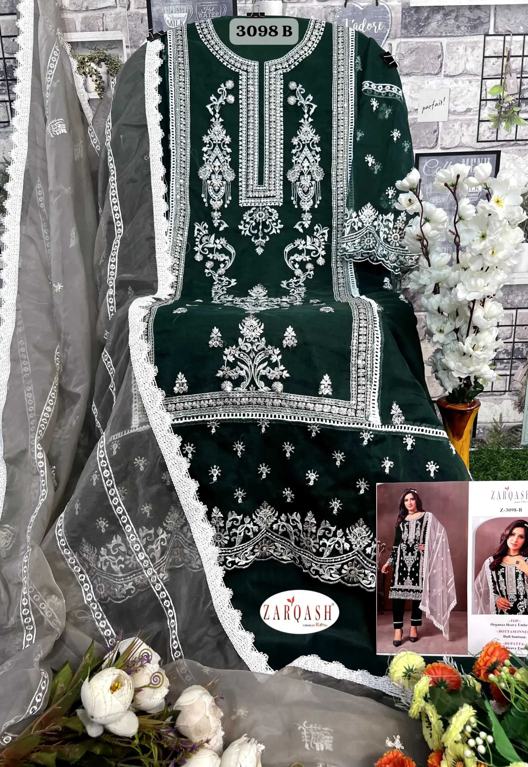 This description is typical of a South Asian outfit, possibly a salwar suit or an Anarkali suit, which would be suitable for formal events, celebrations, or possibly weddings. The embroidered organza adds a level of sophistication to the outfit, and the availability of different colors allows for personal preference in styling.