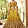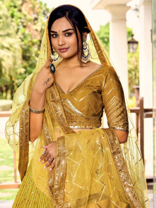 Elegant thread and sequin embroidery on the lehenga and blouse give this yellow ensemble a festive charm. The soft net dupatta in light yellow features matching sequin work with a decorative lace border—ideal for haldi functions and pre-wedding celebrations.