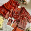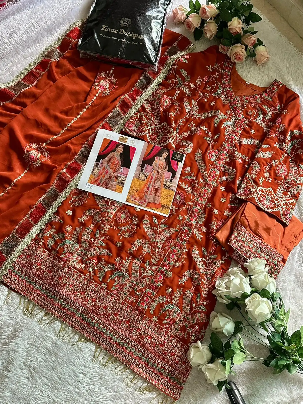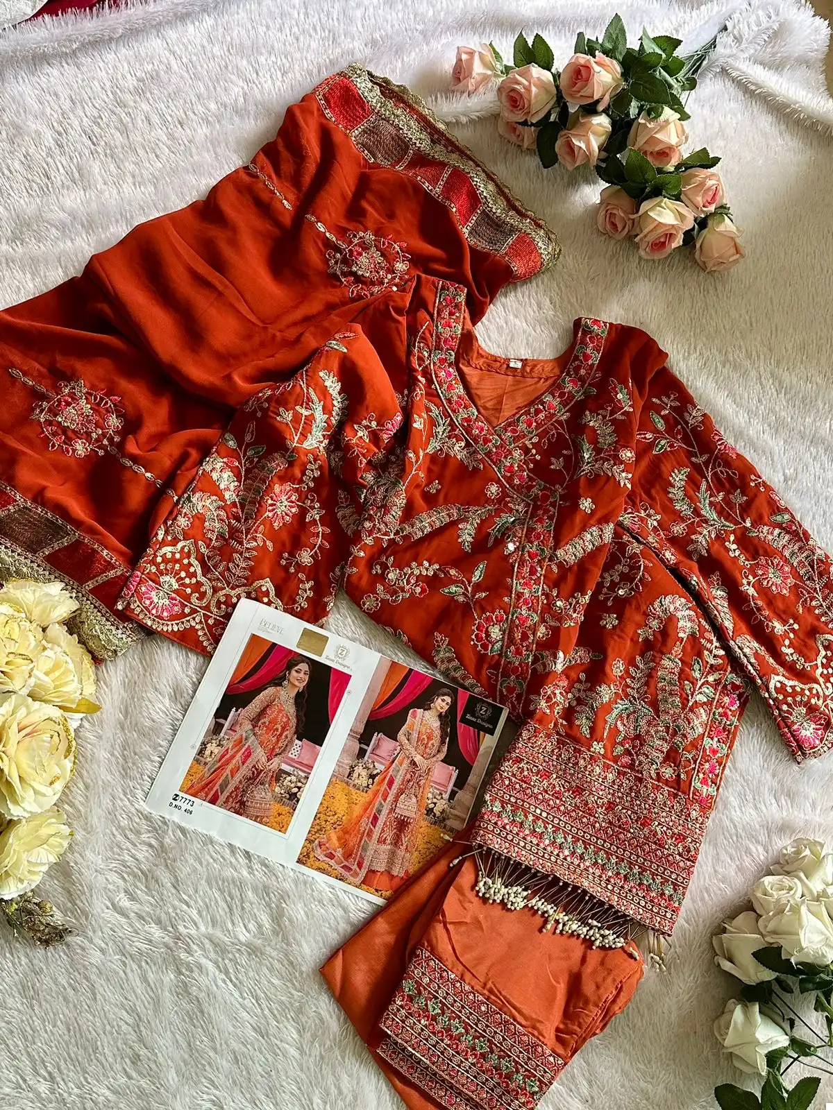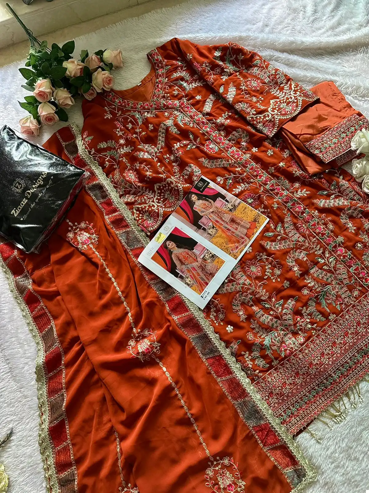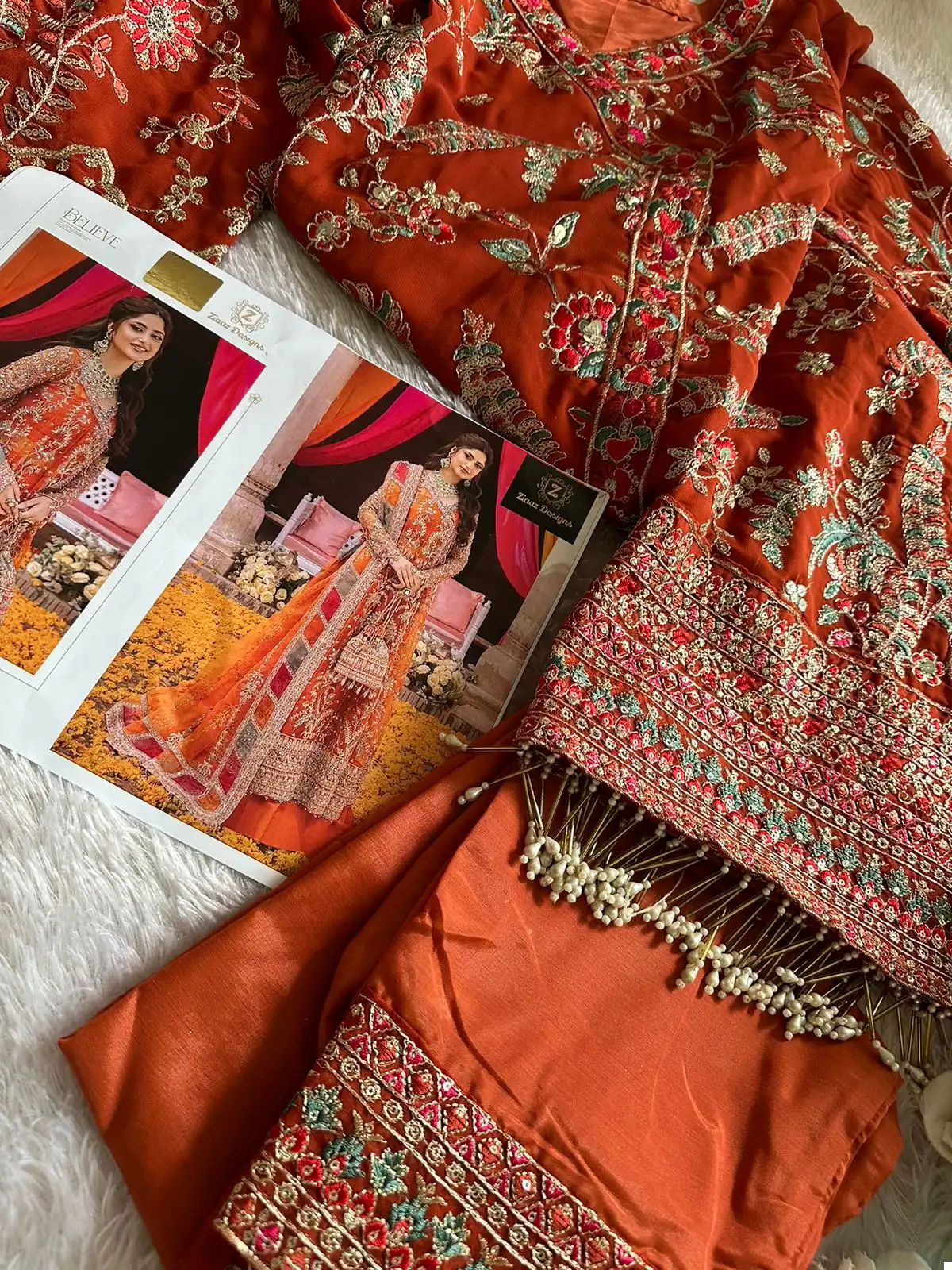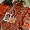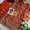 Dupatta (Organza Heavy Embroidered): The organza dupatta is the crowning jewel of this outfit. It boasts heavy embroidery that complements the top beautifully. When draped, it adds a touch of elegance and completes the look.