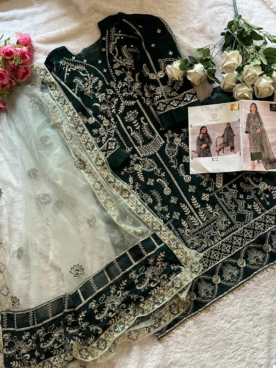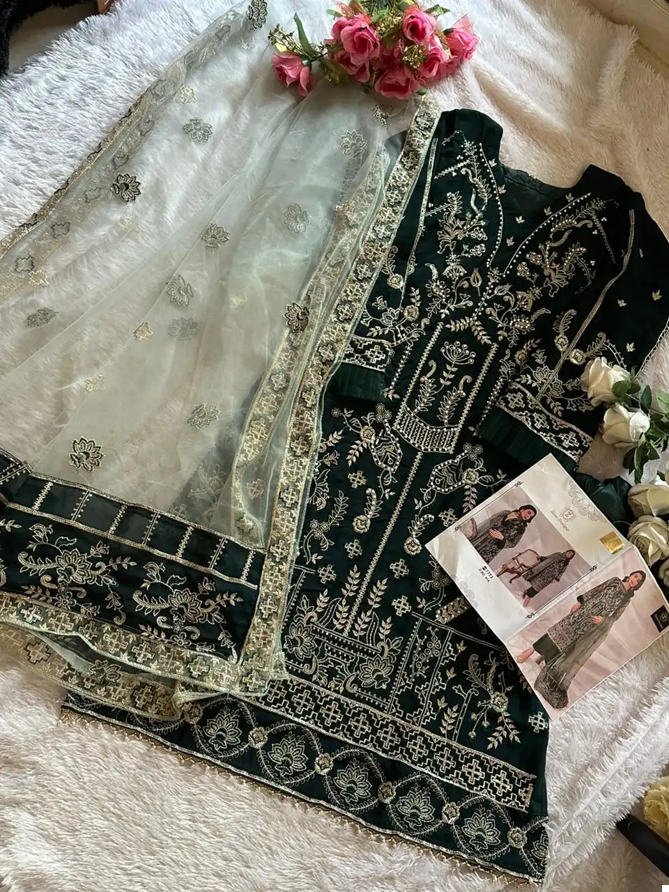 The mint green net dupatta is heavily embroidered, adding a touch of elegance to your ensemble.