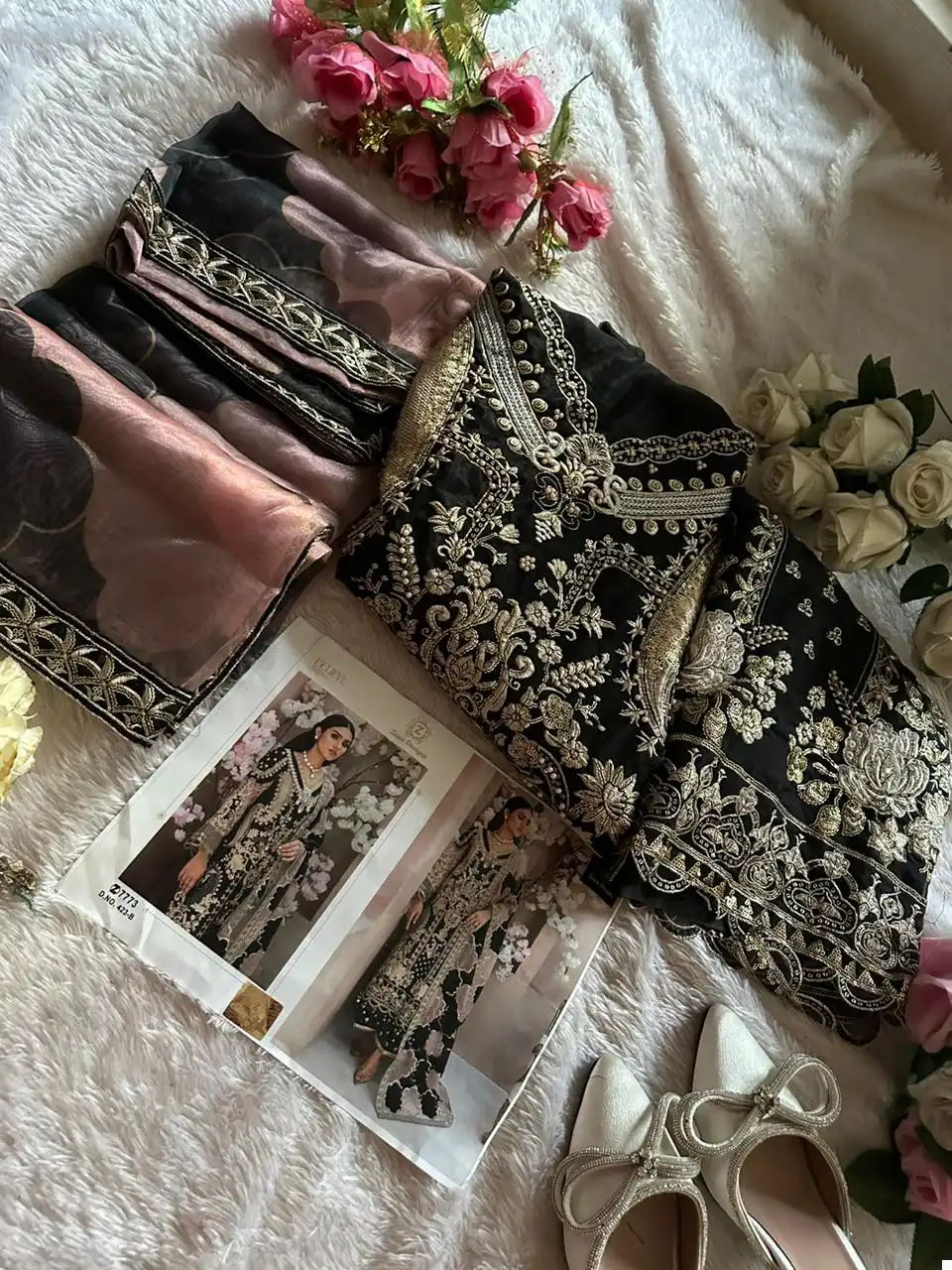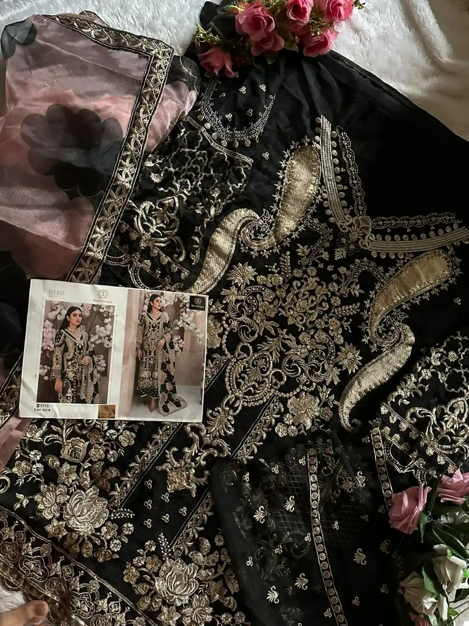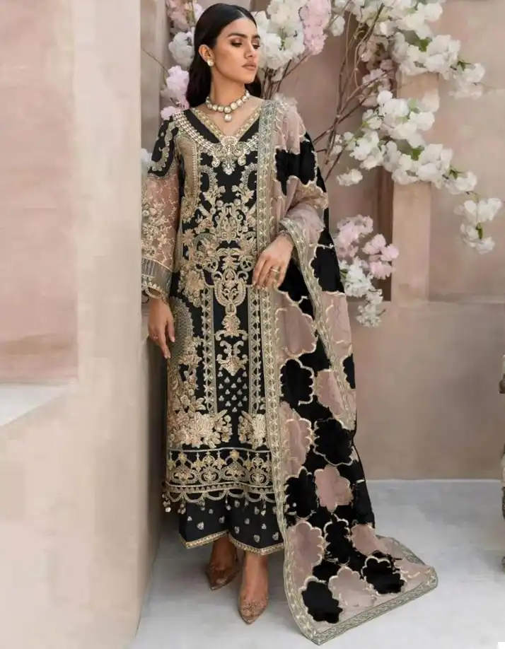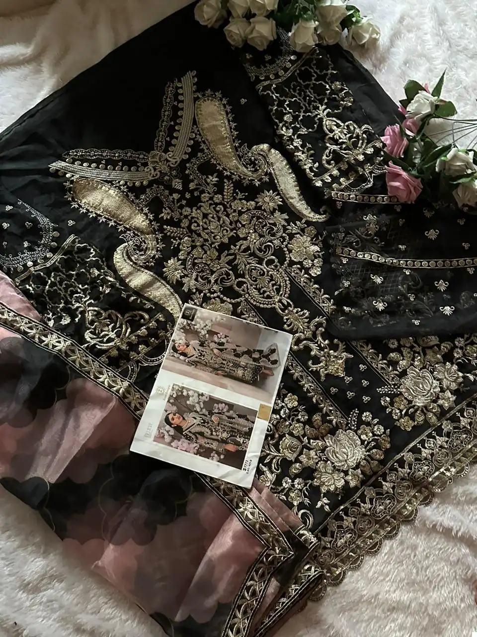 The set is completed with an organza printed dupatta featuring embroidered borders. The dupatta adds grace and elegance to the overall look while complementing the embroidery on the top.