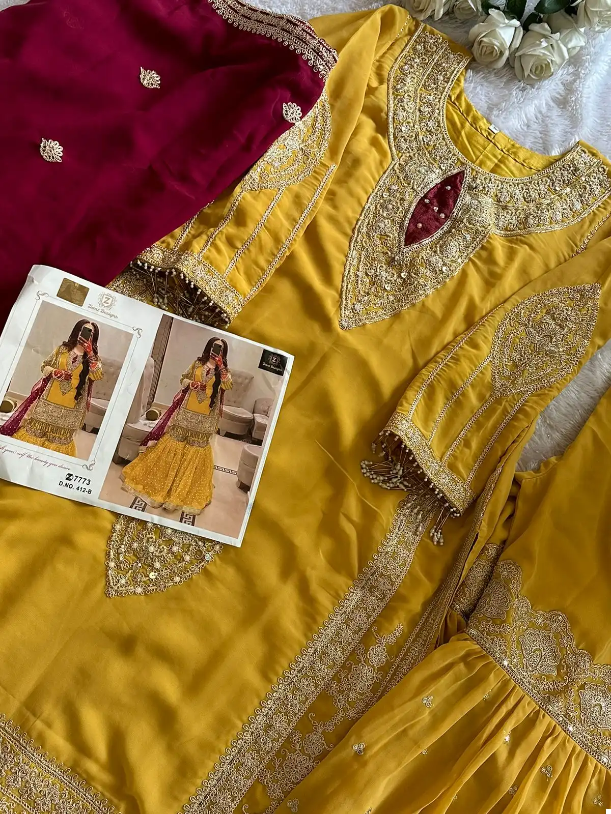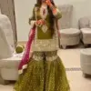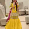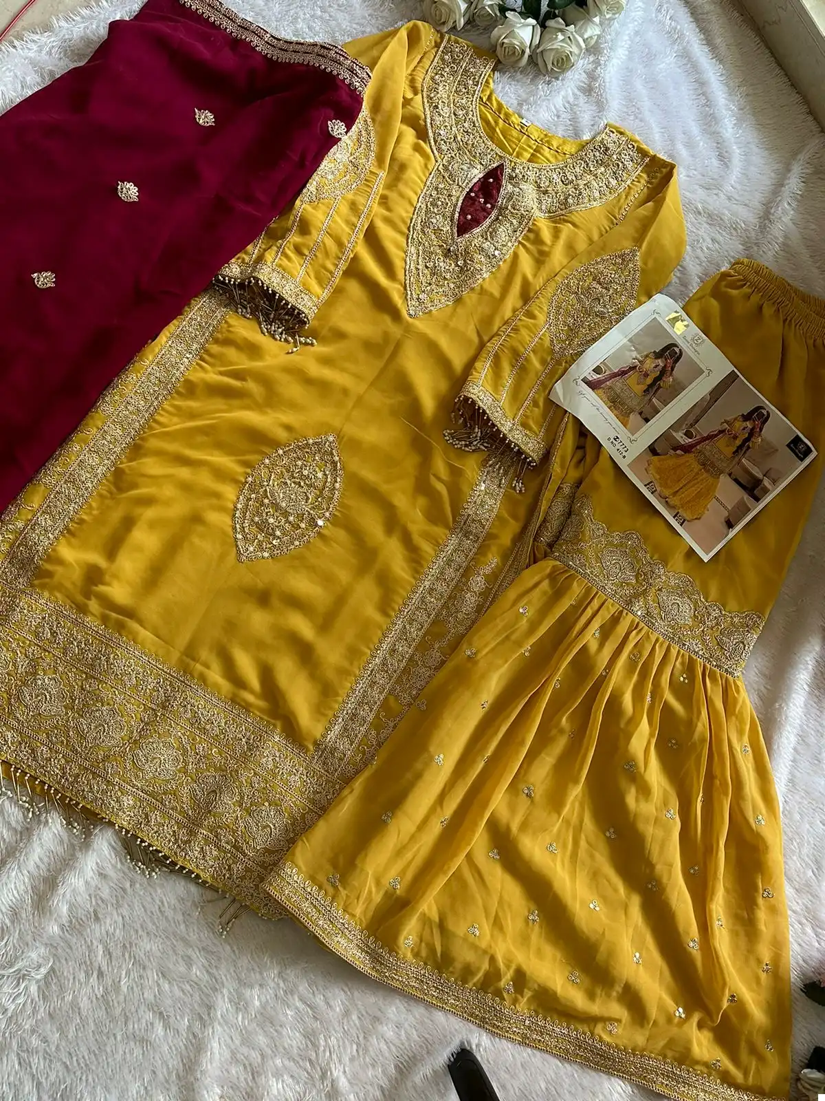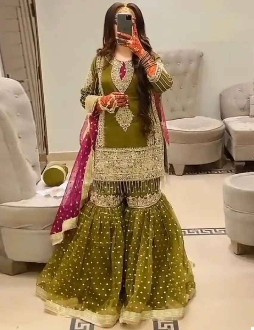 - Bottom: Complementing the kameez is a stitched Georgette Gharara. The Gharara retains the fluidity and grace of Georgette, while its stitched design ensures ease of wear. The combination of the kameez and Gharara creates a harmonious and elegant look.