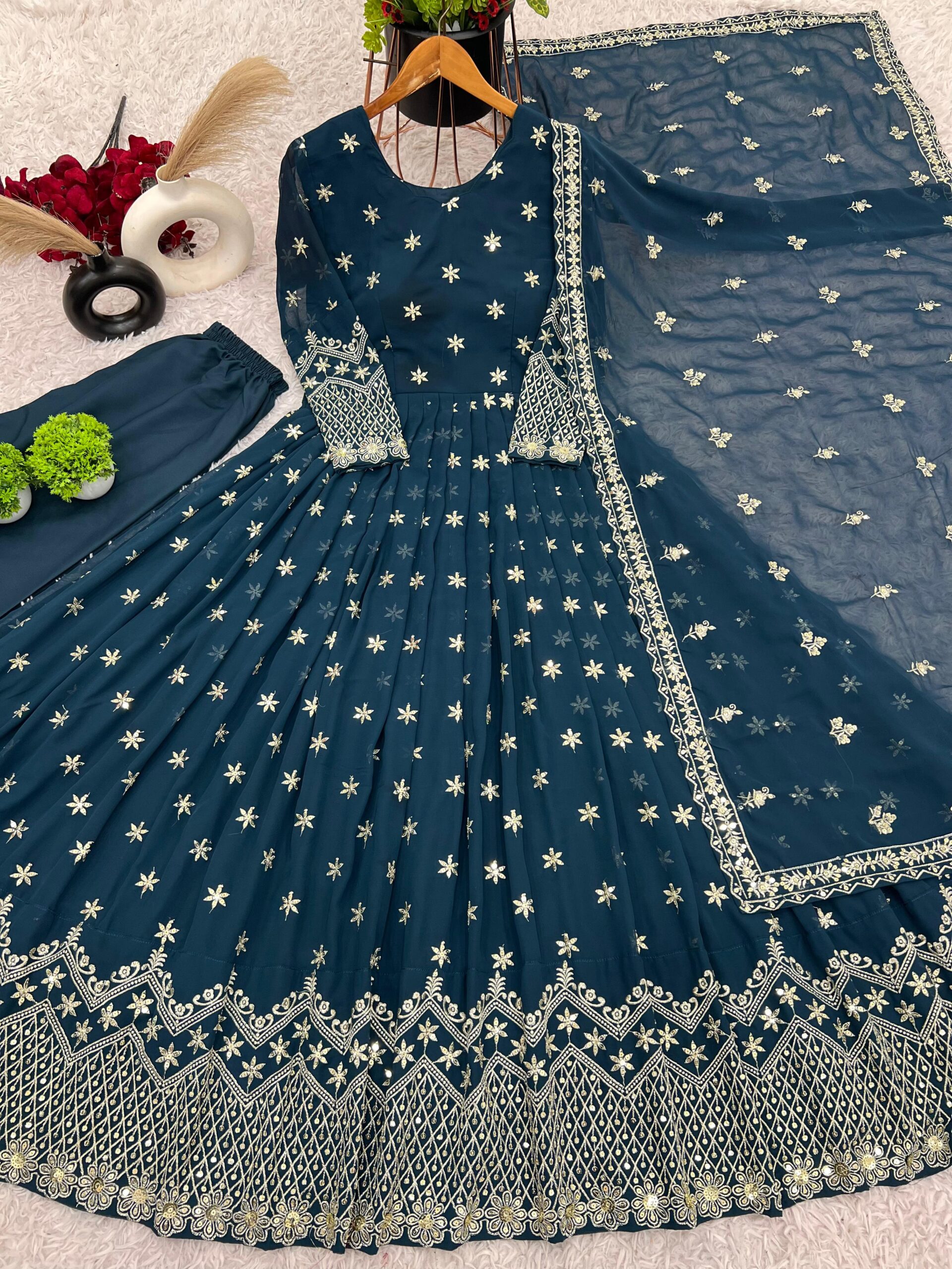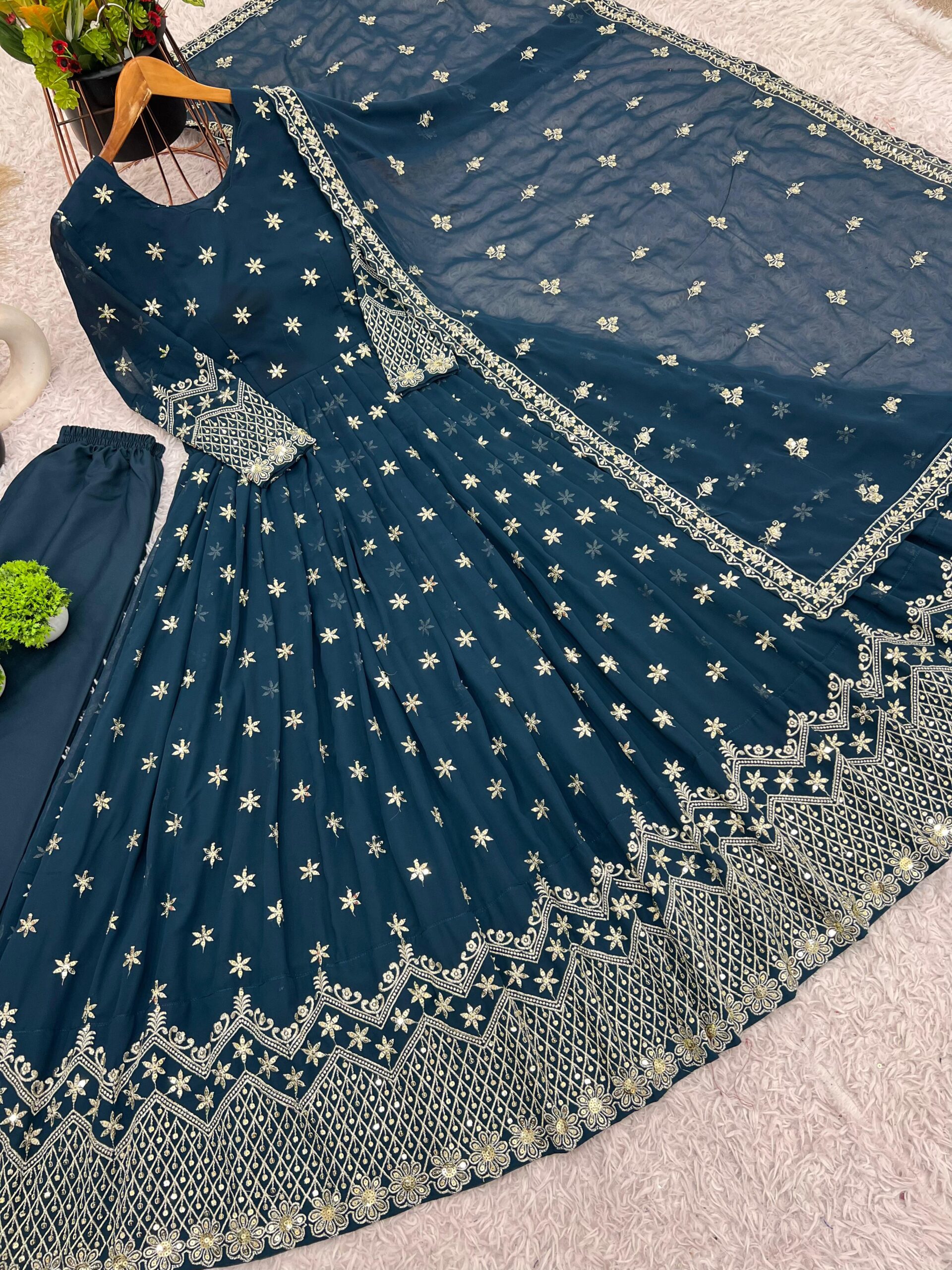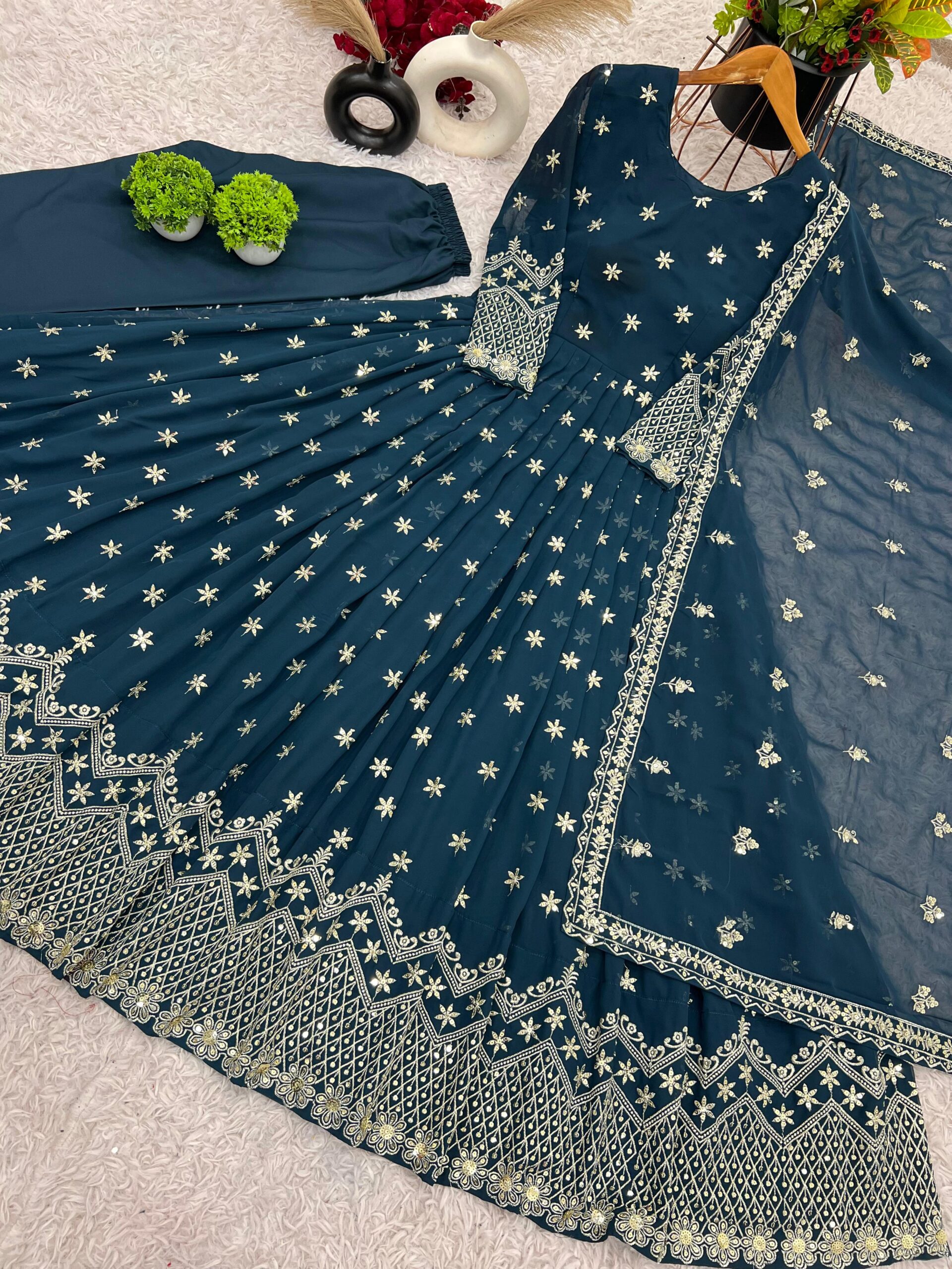 Presenting a stunning gown crafted from Heavy Faux Georgette with exquisite full embroidery and sequence work, making it the perfect attire for weddings, receptions, or grand celebrations. The gown features intricate details that shine with every movement, making it an attention-grabbing choice for any occasion. The micro cotton inner ensures comfort, while the free size (XL – 42) design fits most body types.