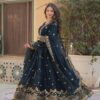 The gown is fully stitched, with a length of 51-52 inches and a gorgeous 3-meter flair, creating a voluminous, flattering look. It is paired with a micro cotton bottom that is full-stitched and elasticized for a perfect fit. The ensemble is completed with a heavy faux georgette dupatta featuring beautiful sequence work and a lace border that adds to the regal charm of the gown.